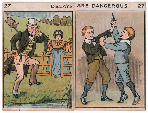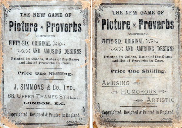 Above: the pack has 56 cards, the backs of the cards are pale yellow. The game is for 5 or more players and consists of 28 pairs of cards illustrating popular Victorian proverbs which were seen as words of wisdom or had a moralising innuendo. Play involves asking other players for a card and laying down completed proverbs; the game is won by the player who has completed the most proverbs. In the event of a player not knowing the words to complete the proverb, he may ask for the number.