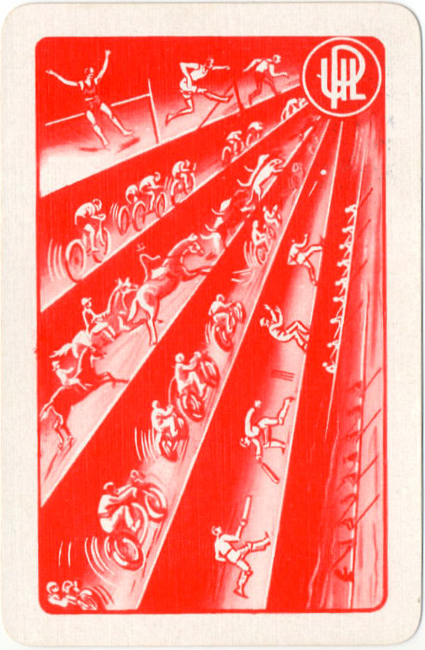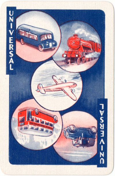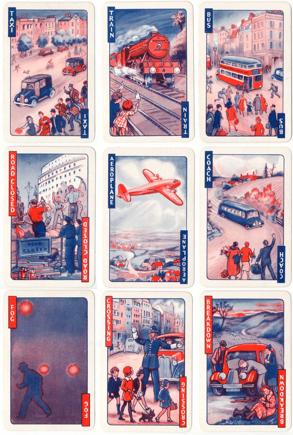 Rush Hour card game depicting different modes of transport published by Universal Publications Ltd, London, c.1935. 52 cards, printed in red & blue.