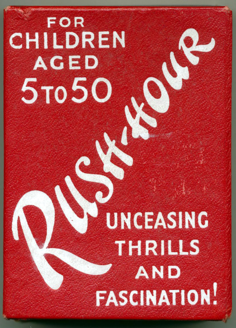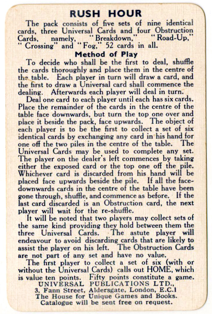 Above: “Rush Hour” card game by Universal Publications Ltd, London, c.1935. 52 cards in slip case. The rules card gives the company address at 3 Fann Street, Aldersgate, London E.C.1. The 1941 company catalogue gives the address as 9 Inverness Place with the footnote "Formerly at 3, Fann St. EC1" strongly suggesting that this card game was produced prior to the publication of the 1941 catalogue. Strangely the 1941 catalogue makes no mention of this game, though it does say some games were destroyed by "enemy action".