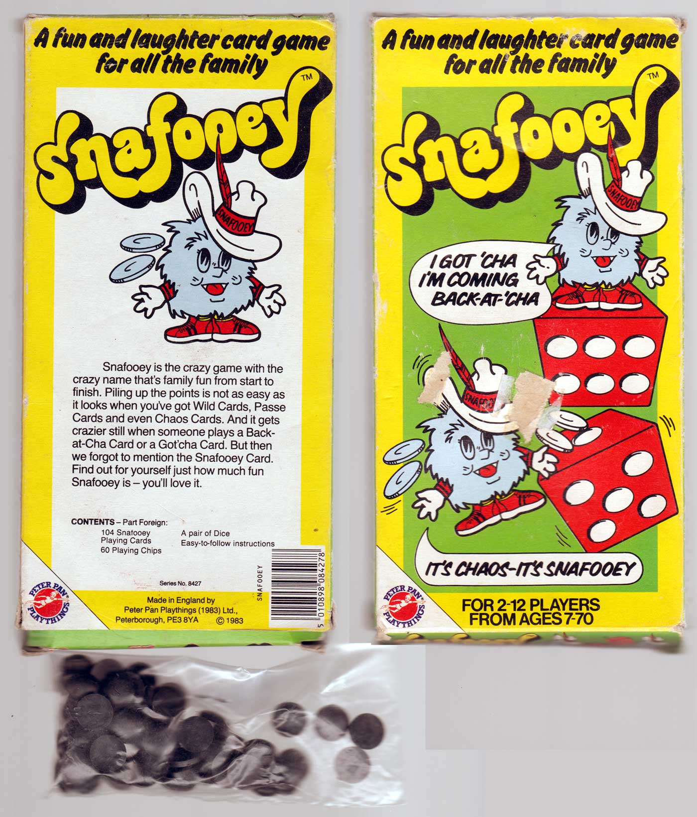 Above: Snafooey card game by Peter Pan Playthings Ltd, Bretton Way, Bretton, Peterborough, PE3 8YA, United Kingdom, 1983. 104 cards + 60 counters + 2 dice + rules leaflet in box.