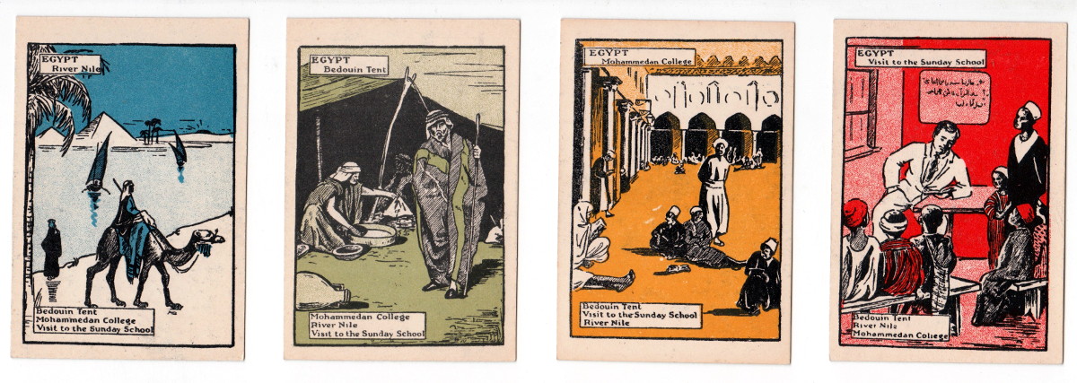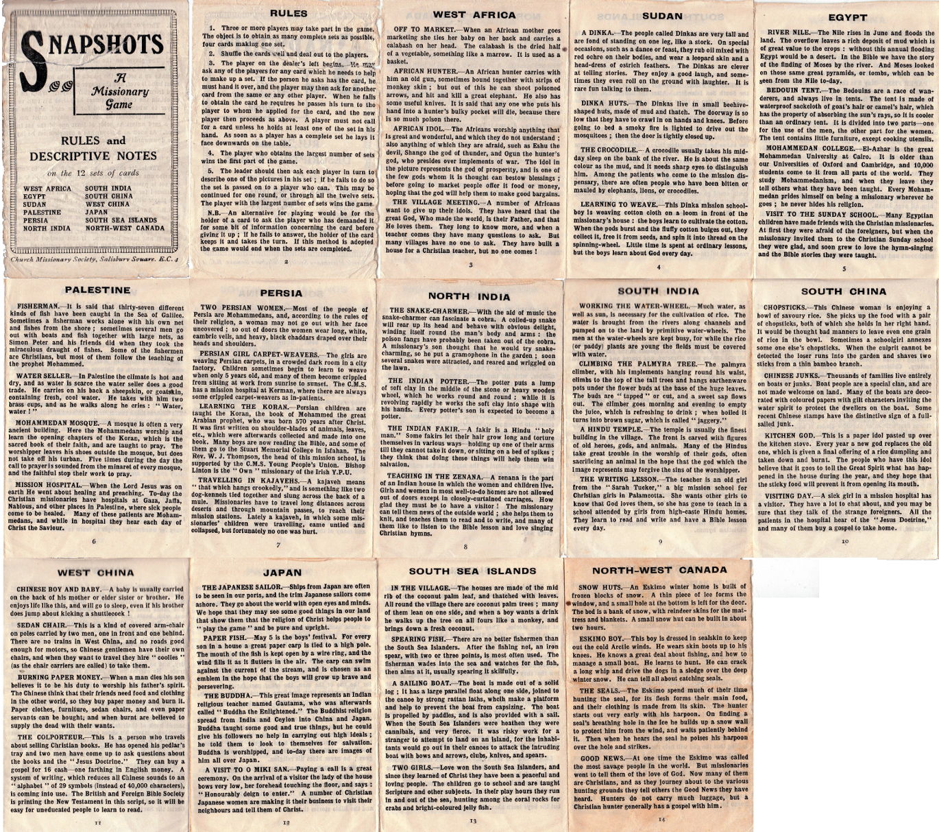 The explanatory notes which accompany the game inform us about different ways of living including religious faith. They also reason that the indigenous people should give up their own religious practices or ‘idol worship’, which cannot save them. Instead, missionaries are there to preach the gospel and convert them to Christianity. Published by the Church Missionary Society, London, c.1910.