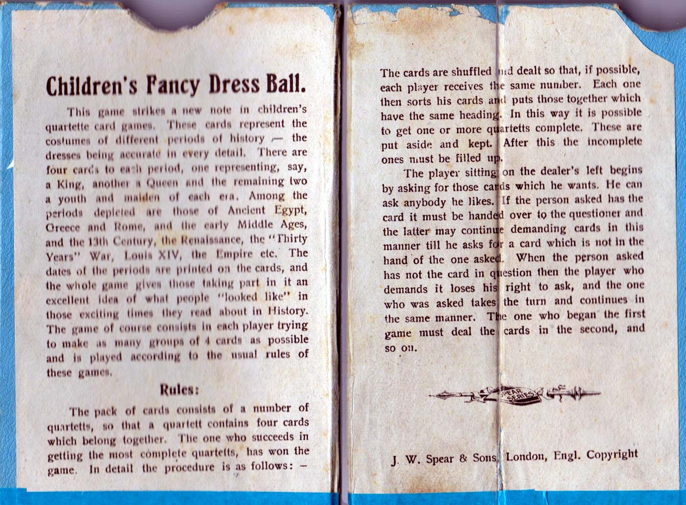 Spear’s “Fancy Dress Ball” quartette card game with children in accurate and detailed costumes from different historical periods,