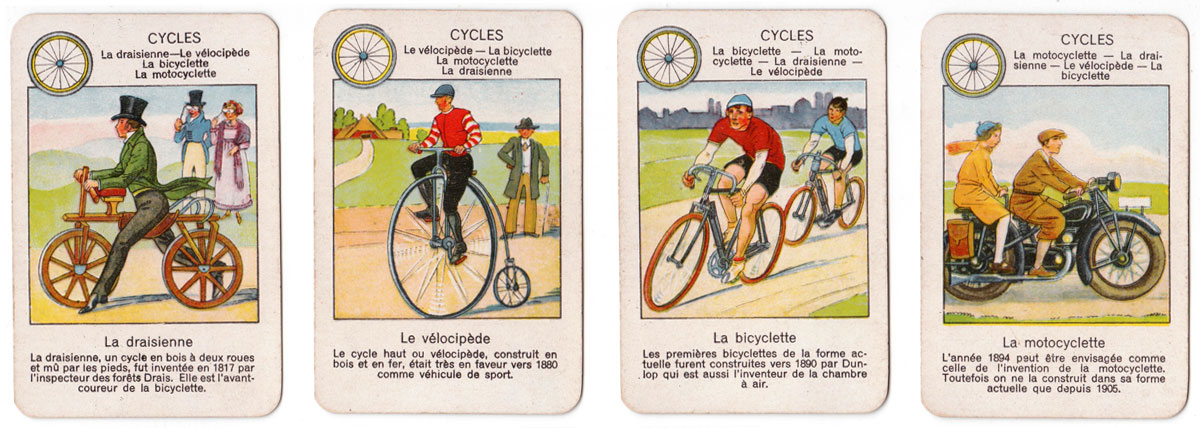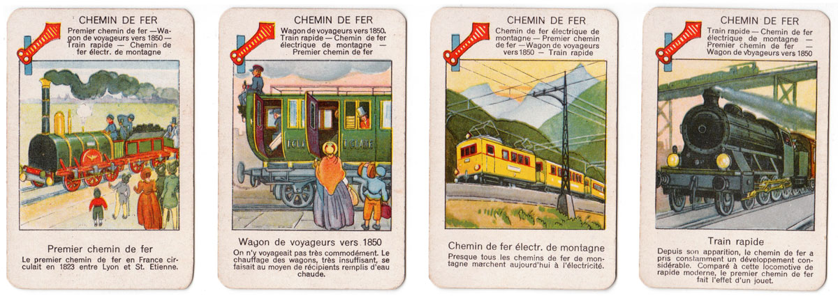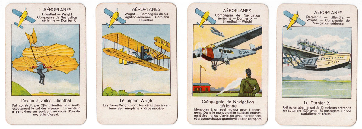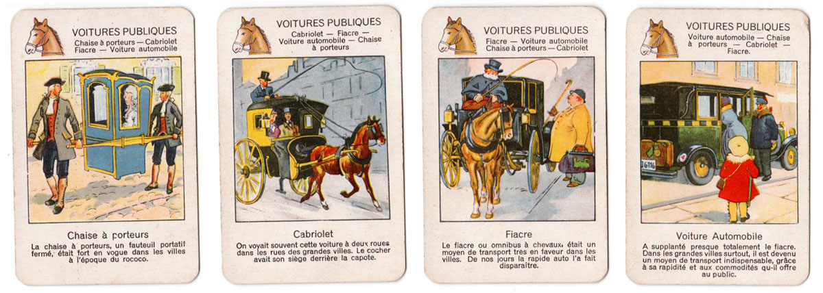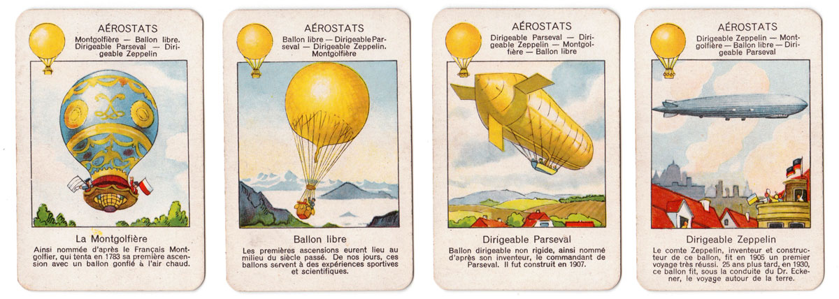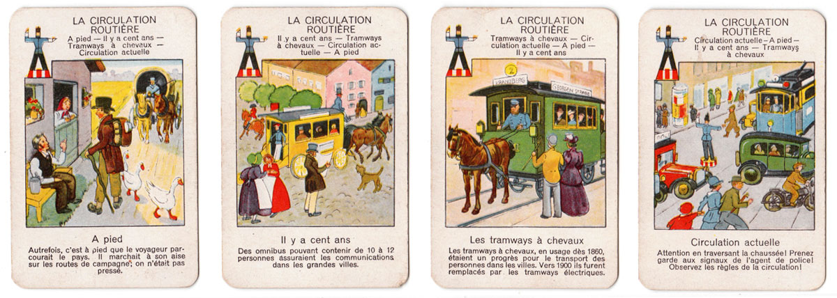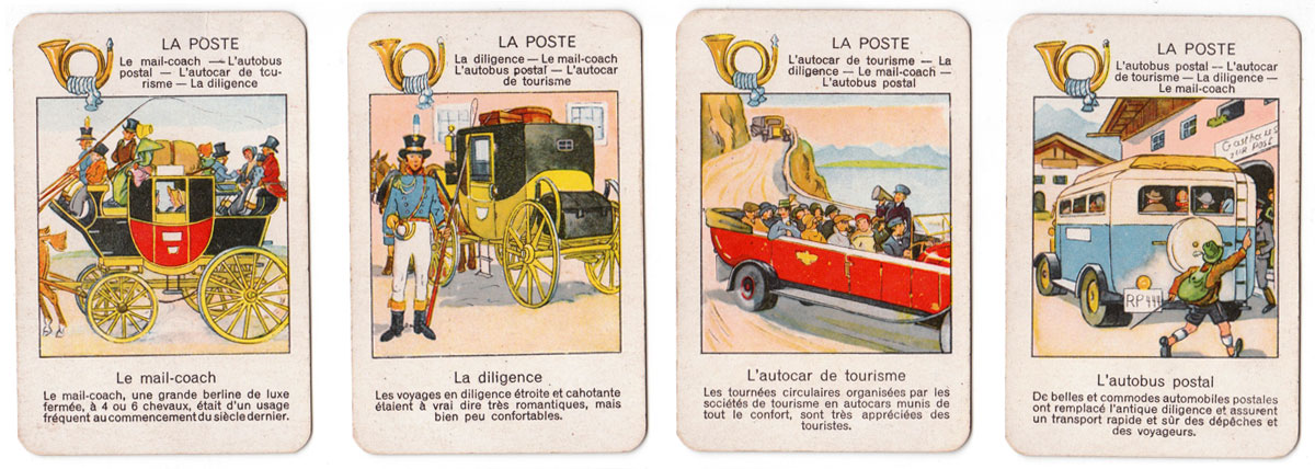 The beautiful images in this quartet game published by Jeux Spear in 1933 depict the progress of transport and travel since early times up til the 1930s.