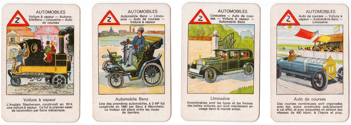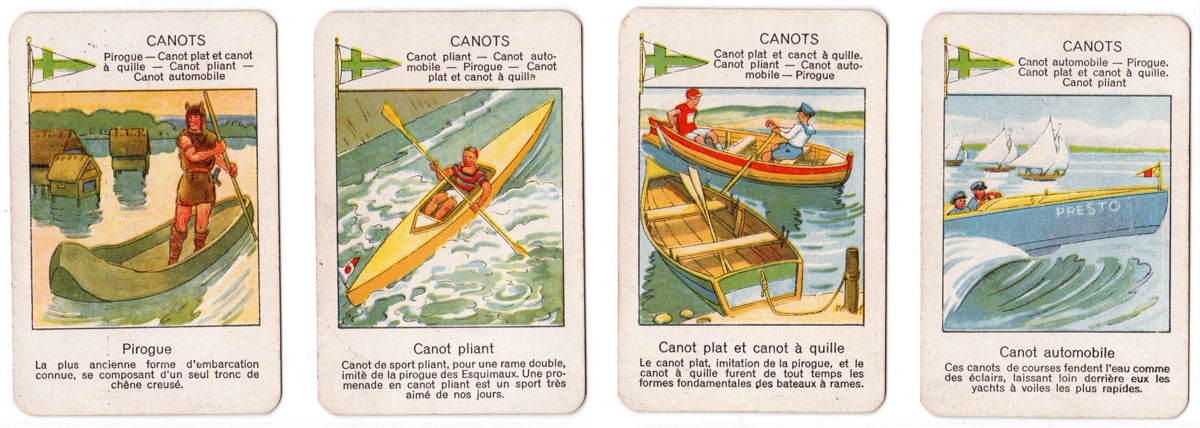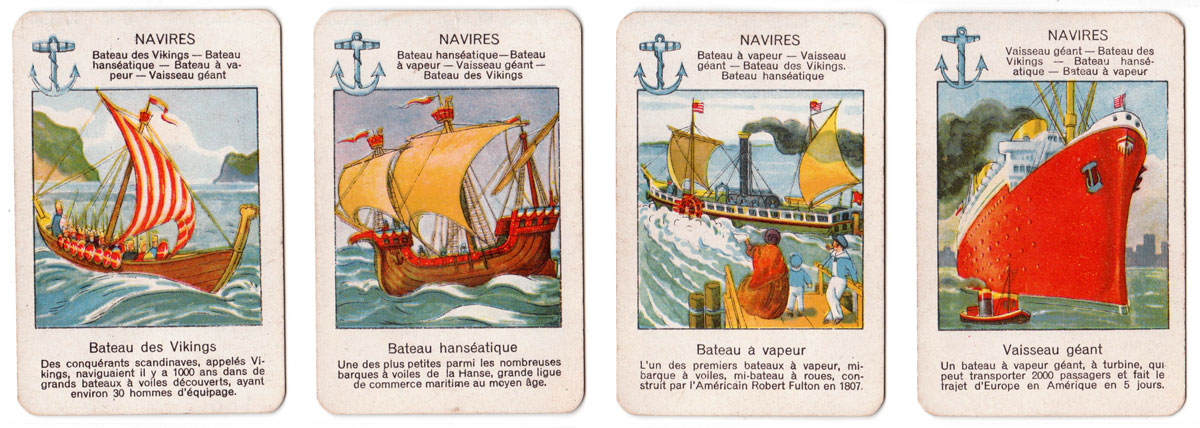 The beautiful images in this quartet game published by Jeux Spear for the French market in 1933 depict the progress of transport and travel since early times (Viking ships, canoe, hot air balloon, etc) up til the 1930s. Each set of four cards has a ‘suit symbol’ at the upper left corner representing the mode of transport, and a brief history of each mode of travel is given at the bottom of each card. 40 cards in box. The cards were manufactured in Germany.