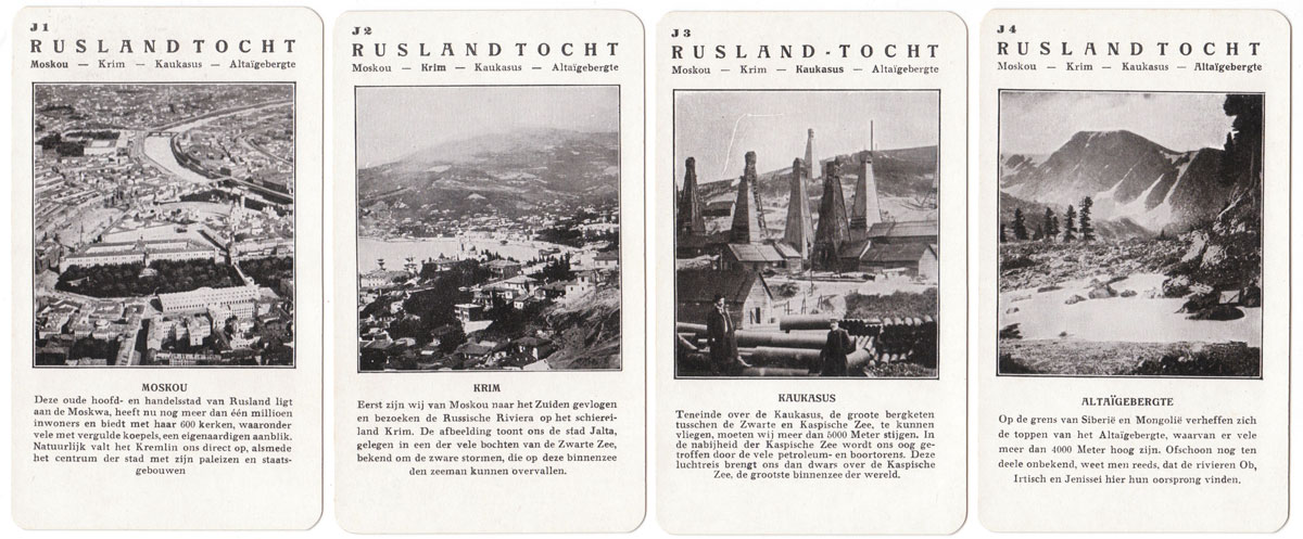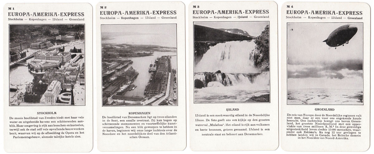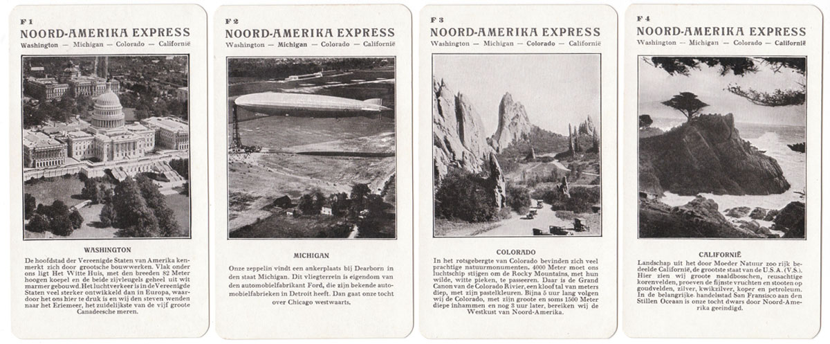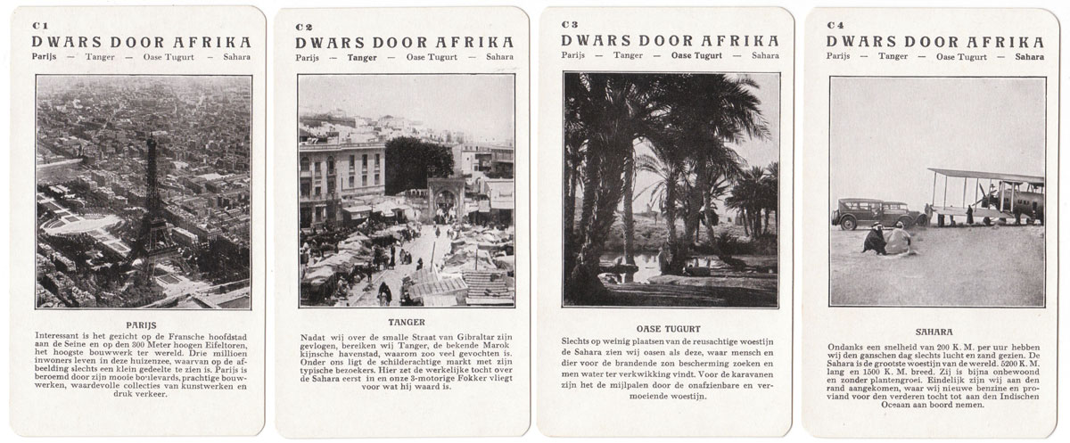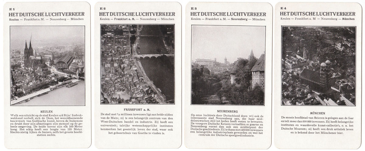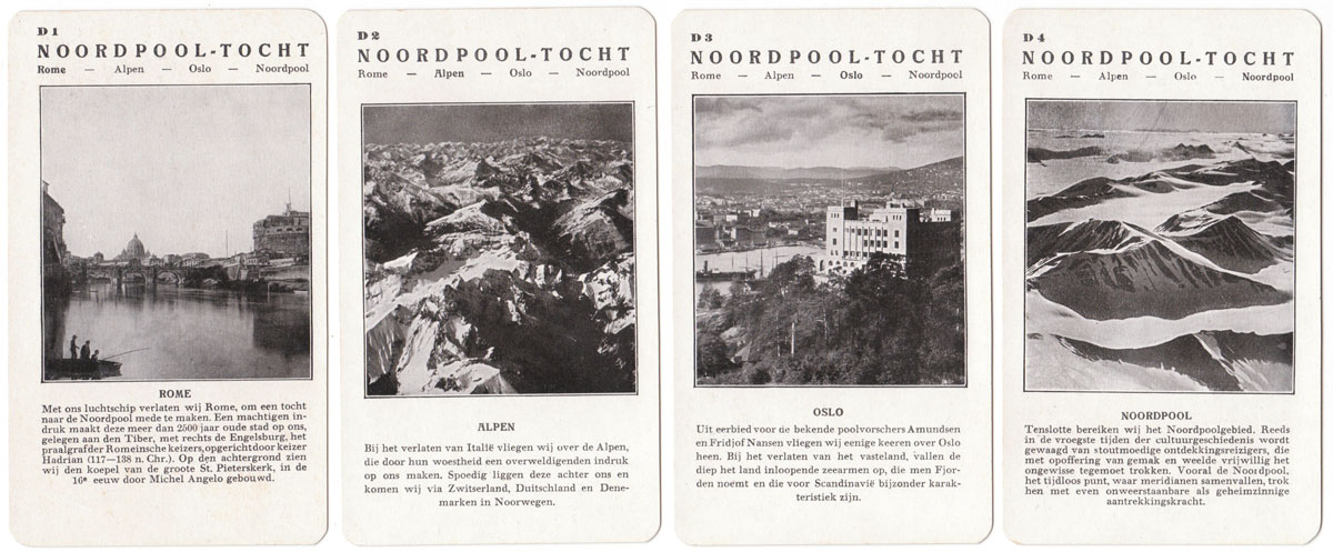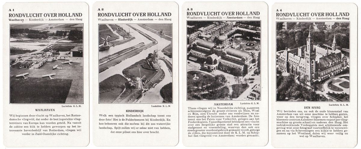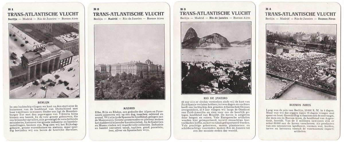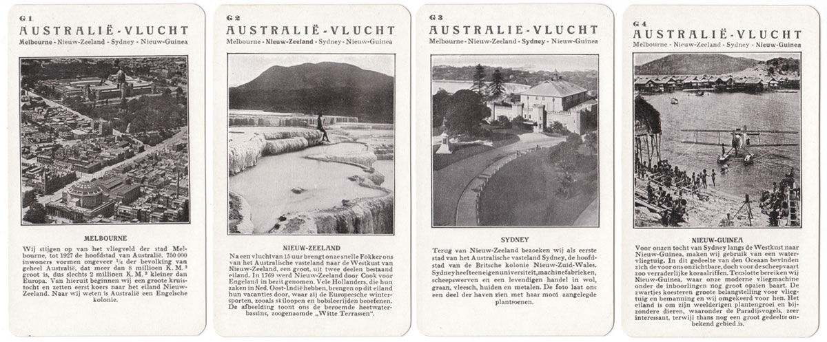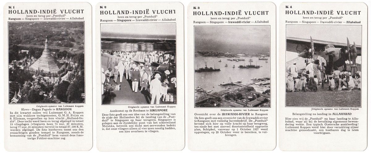 Spears “Weltflug Quartette” was produced in German, Dutch and English versions and may well have been produced in other languages too. The version illustrated is the Dutch version called “Wereldvlucht Kwartet” and set A is specifically for the Dutch market with pictures of a flight over Holland. Also the set K is a flight to the Dutch East Indies for the benefit of Dutch players. Lieutenant G Koppen carried out trial flights to Batavia (now Jakarta) in the Dutch East Indies in 1927 in a Fokker Trimotor to test the suitability for a KLM regular route. His flight out took 10 days and the return flight took 12 days. Illustrated below is a Map of the route that was eventually established.