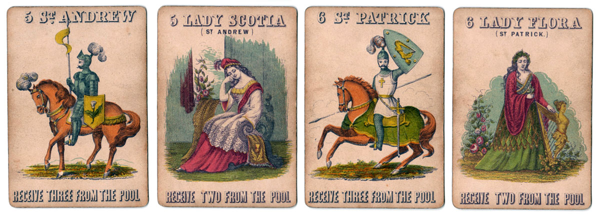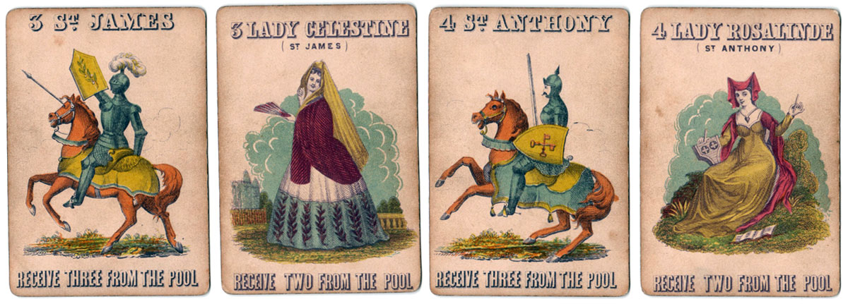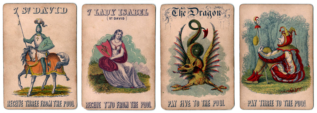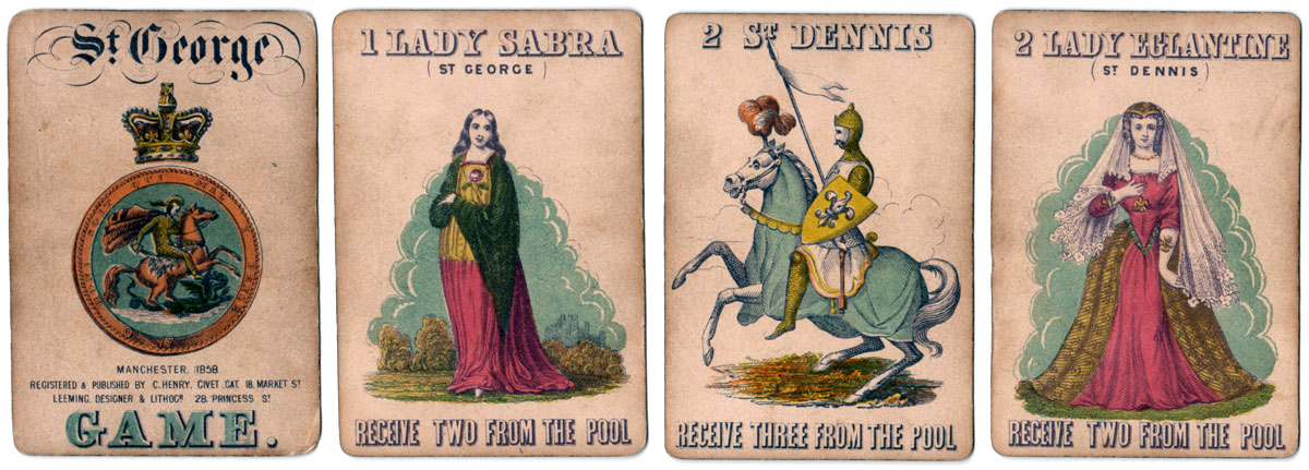 Published in Manchester, England, in 1858 by C. Henry, printed and designed by Leeming Lithographer, to be played in the Victorian family home. The figure cards show St George and other saints with their ladies in medieval attire engaged in battle, slaying the dragon to save souls from perdition. Because only heroes of uncommon valour, courage and purity could hope to subdue these monsters and emerge victorious, the images have an underlying moral and ethical implication. For Victorian parents the upbringing of their children was the most important responsibility. They believed that a child must know the difference between right and wrong in order to become a thoughtful, moral adult.