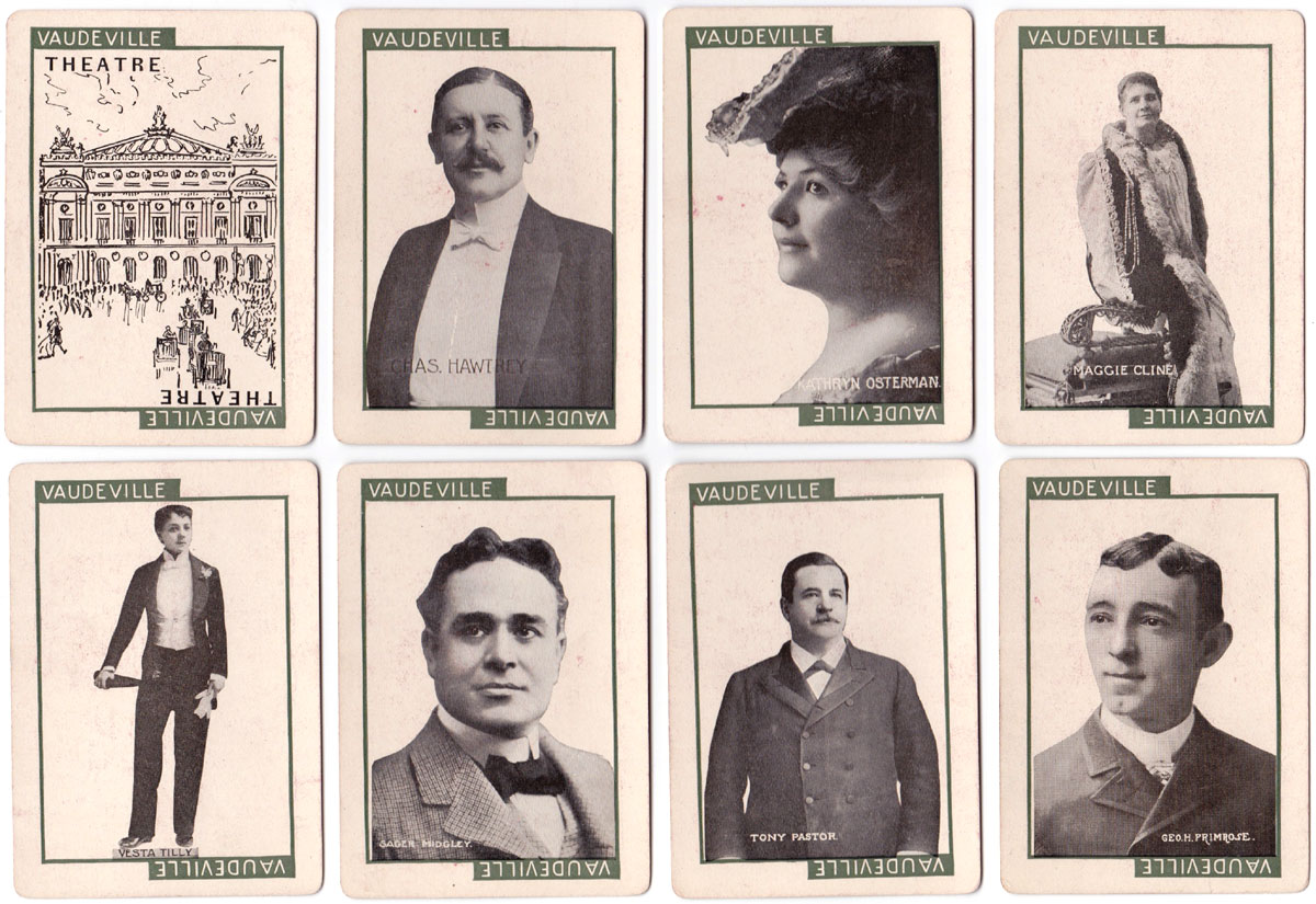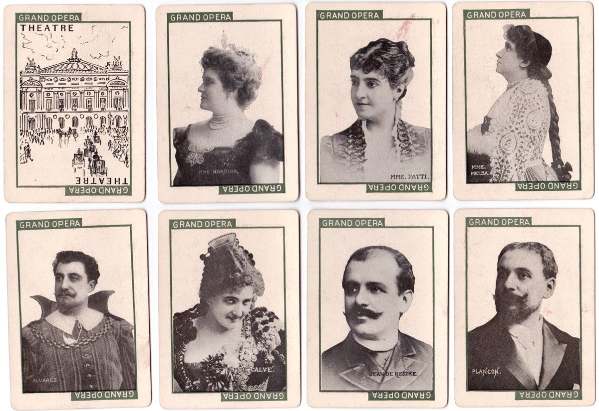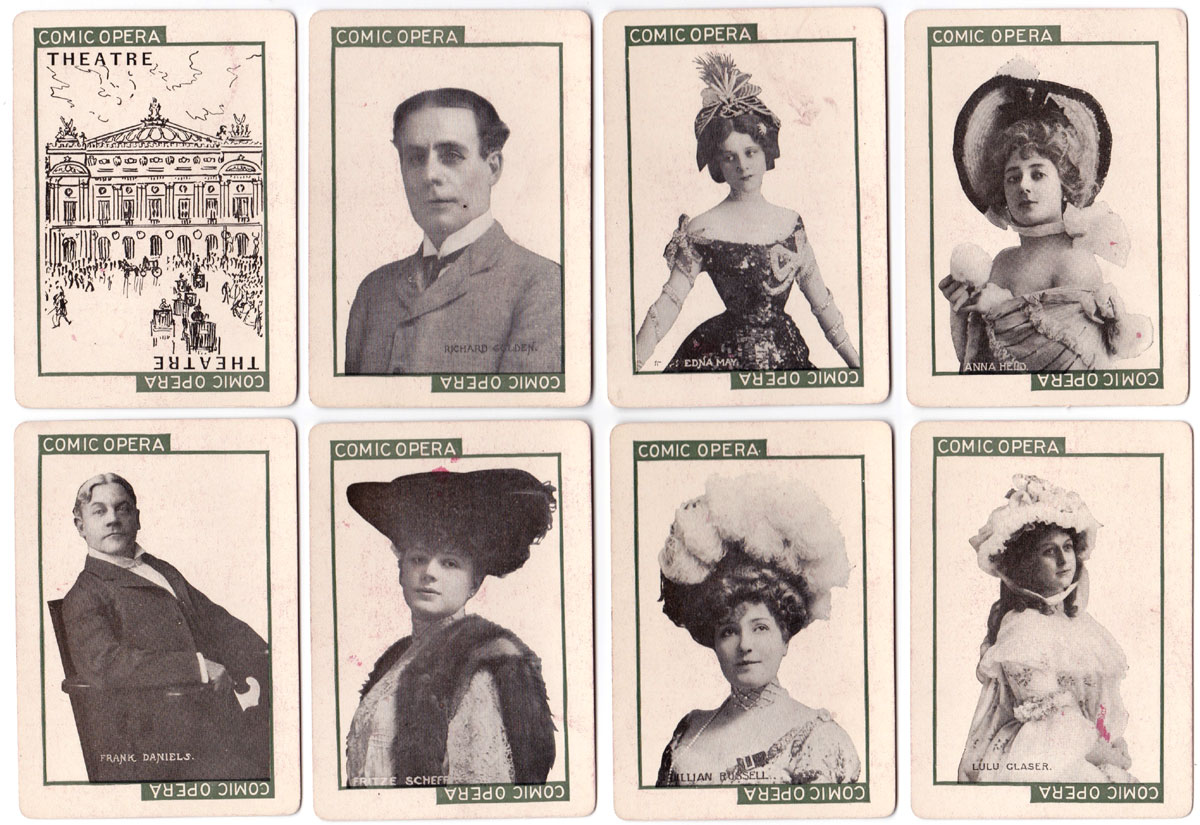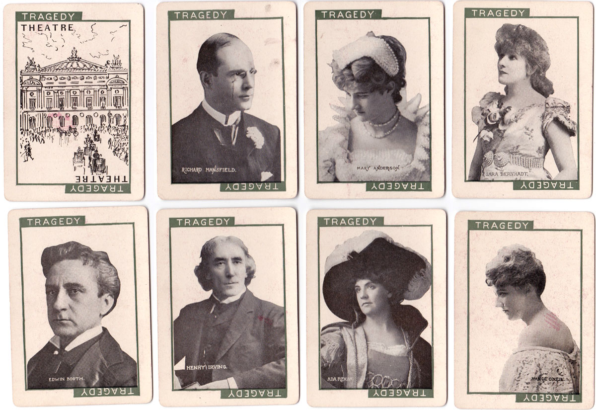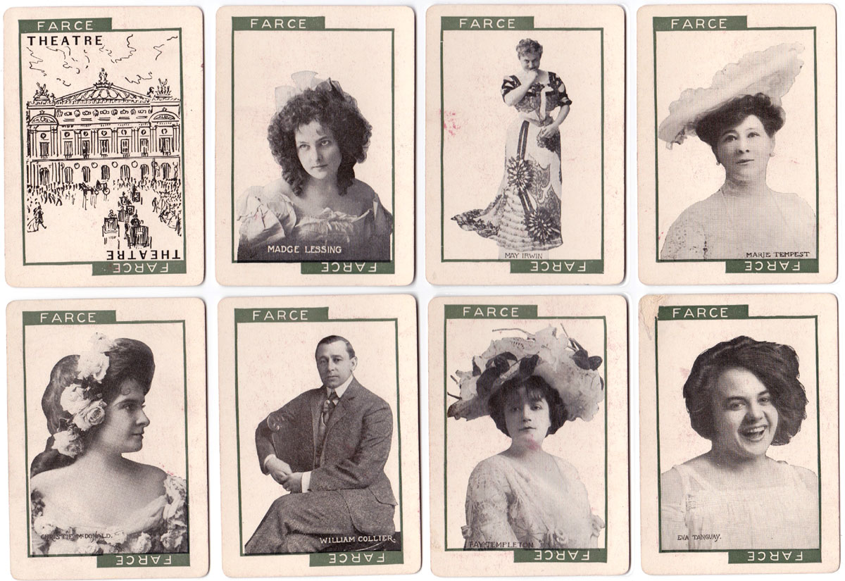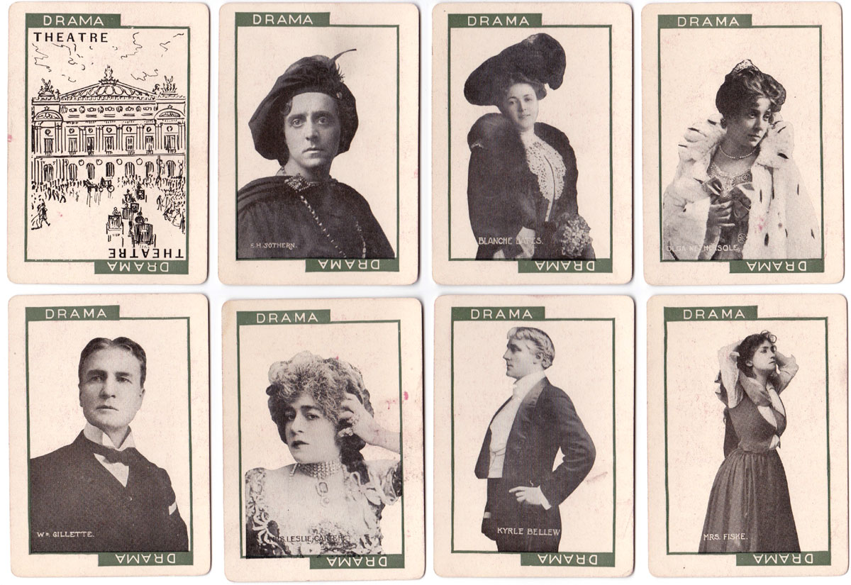 ‘Stage’ novelty card game was published in 1904 by C. M. Clark Publishing Co. Boston, Massachusetts with portraits of popular actors and actresses. Contemporary advertising described the game as the “Newest and Best of all Card Games”, “Learned in a Twinkling” and “Never Forgotten” which today might be equivalent to the excitement of playing pokies. Seven branches of drama are represented: Grand Opera, Tragedy, Drama, Comedy, Comic Opera, Vaudeville and Farce, along with Audience, Holiday, Blizzard and Deadhead cards. The object of the game is to be the first player to fill one of the classes of theatre with the artists that belong there and an audience. C. M. Clark Publishing was in existence until 1912.