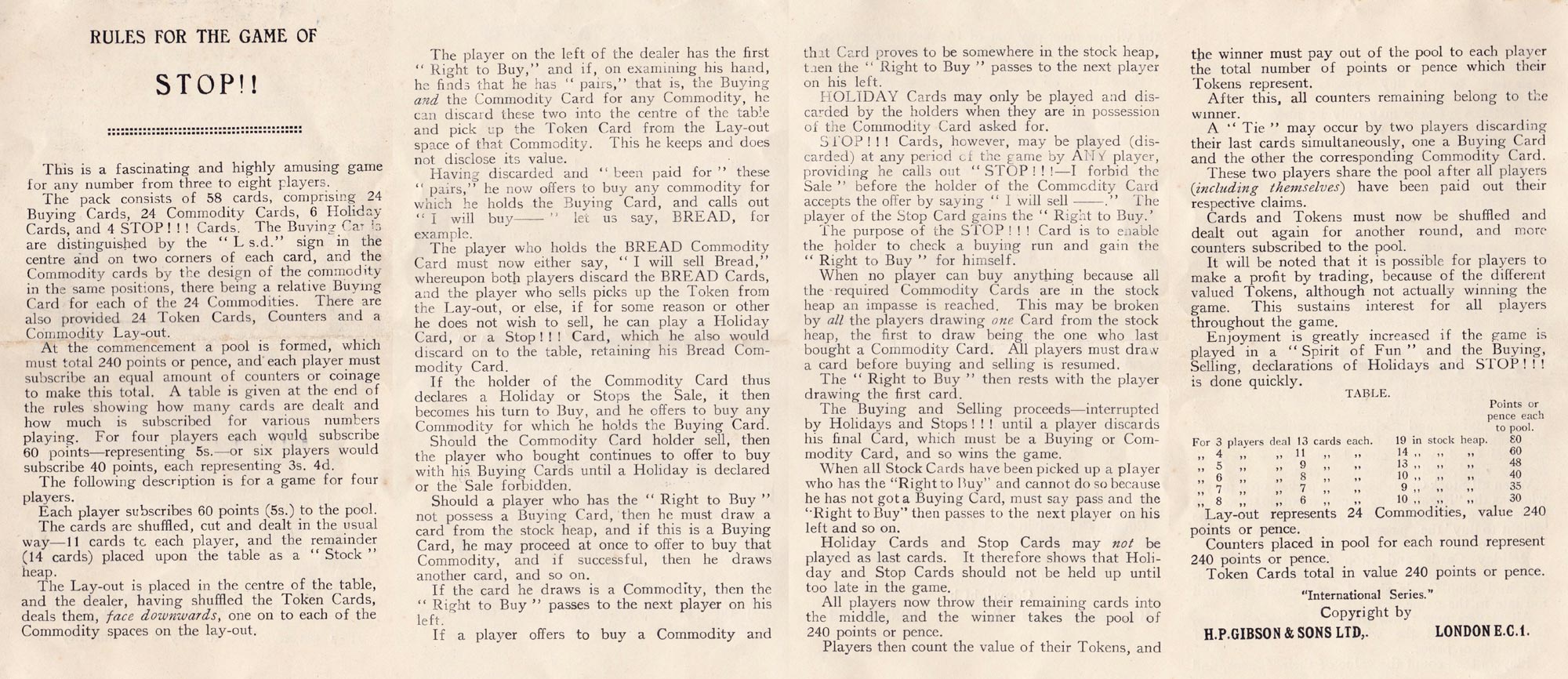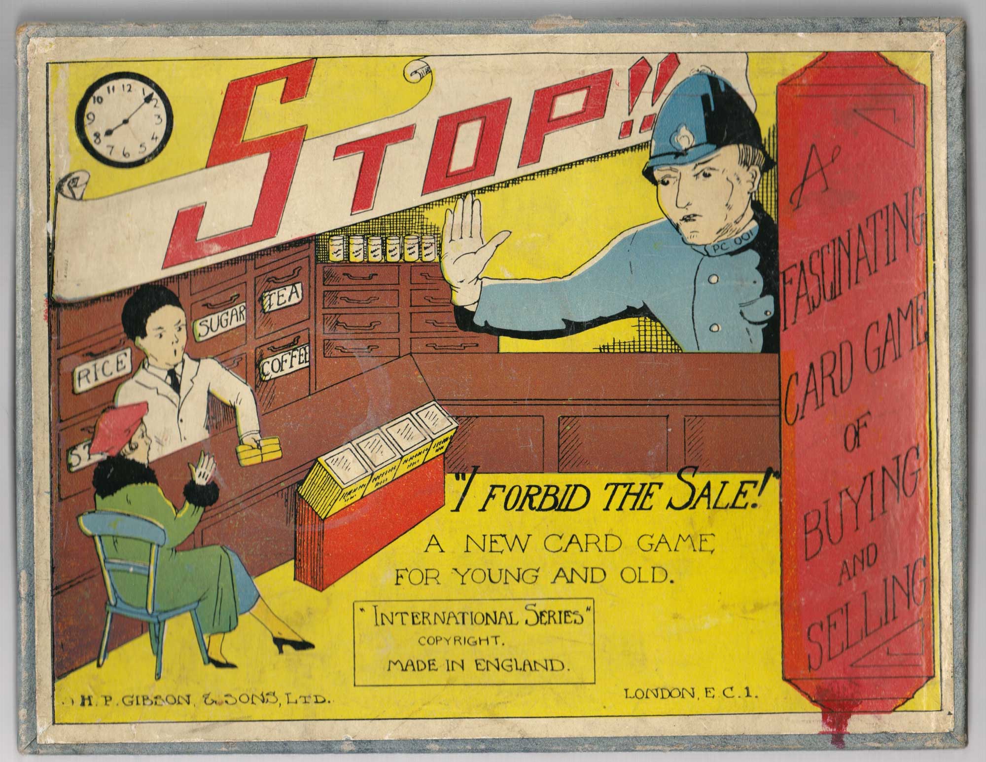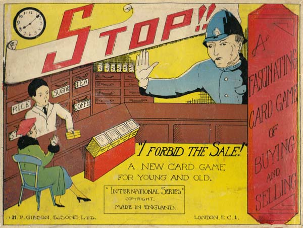 “Stop! I forbid the Sale!” trading game published by H.P. Gibson & Sons Ltd, c.1939. The pack contains 24 Commodity cards, 24 Buying cards (in £.s.d currency), 6 Holiday cards and 4 Stop cards. There are also 24 Token cards, counters and a commodity lay-out. See the Rules►
