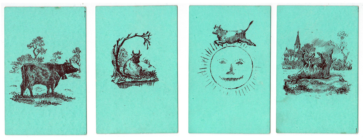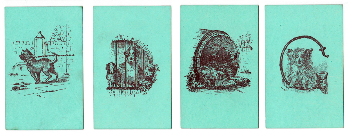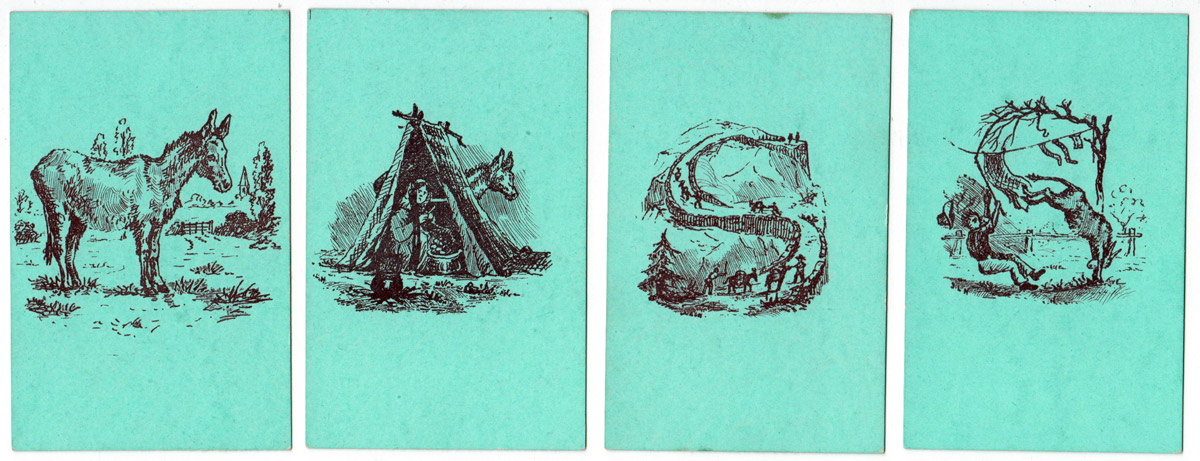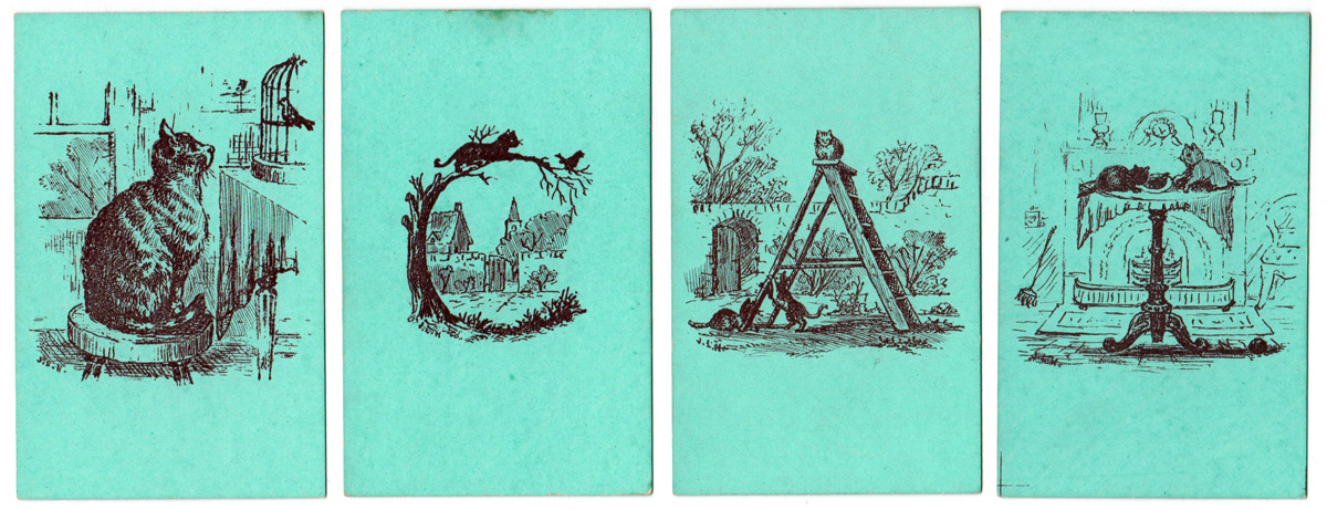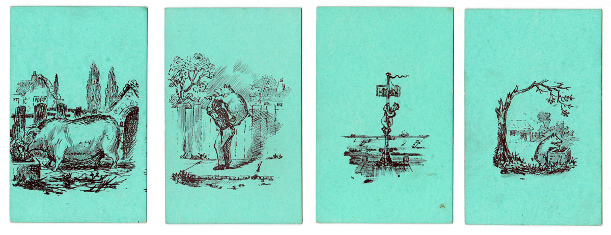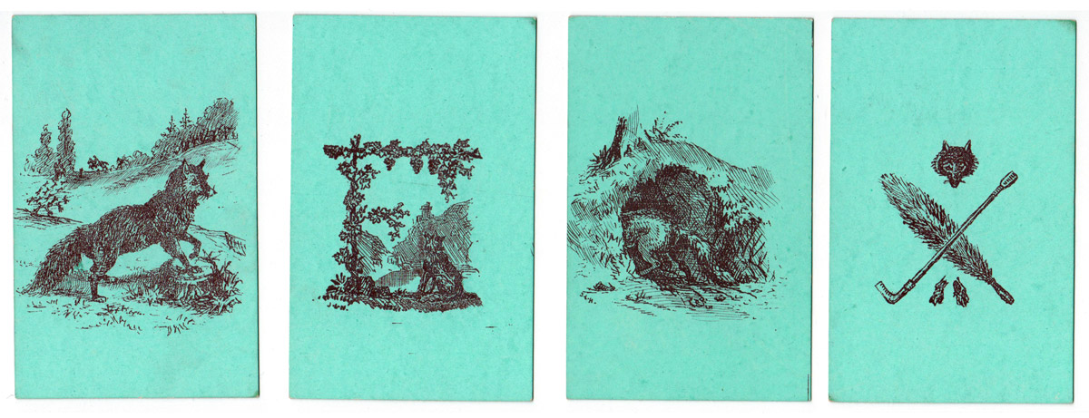 Above: the New Game of Animals, anonymous manufacturer, 1878. The key cards have a picture of an animal: an ass, cat, cow, dog, fox, goat, hare, horse, lion, pig or rat. The others in the set spell the name of the animal with the letters illustrated in pictures. The set of lion cards is double in point value, because he is the 'king of the beasts'. The card backs are plain green. Images courtesy Rex Pitts.