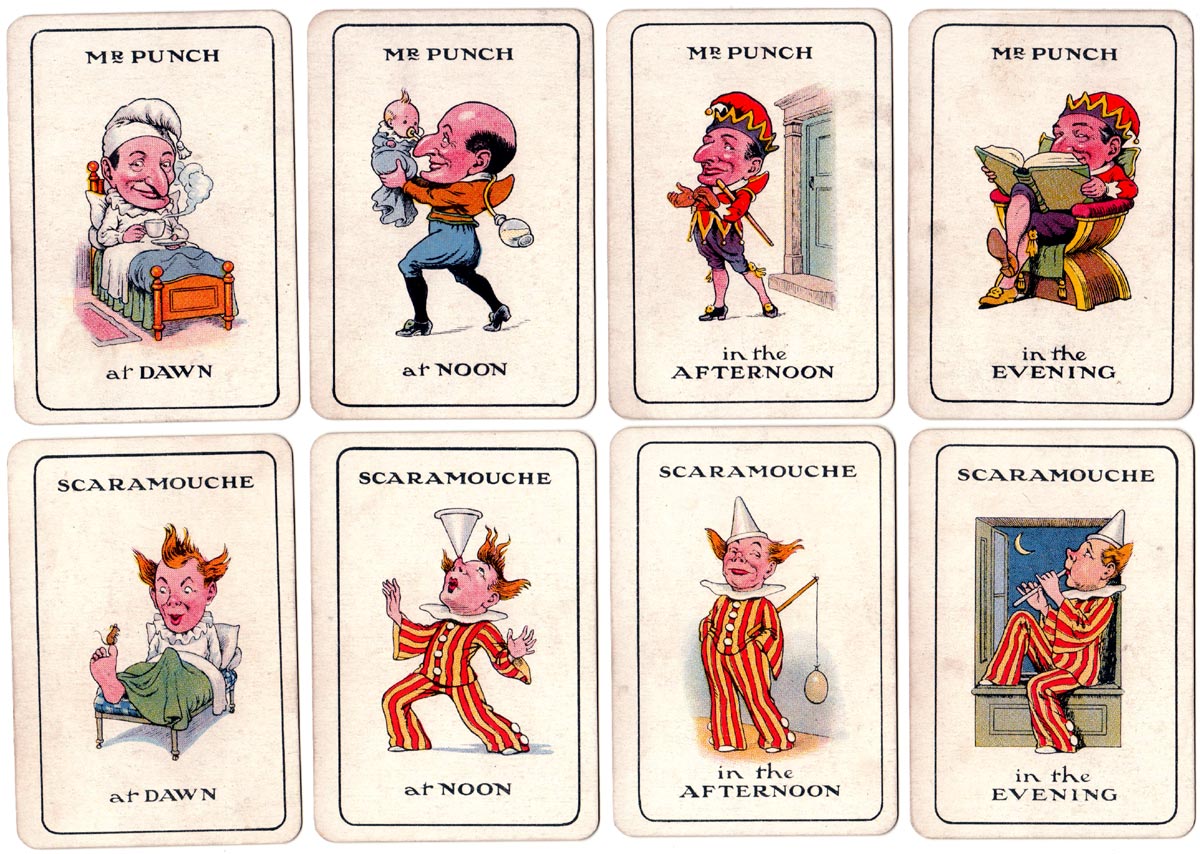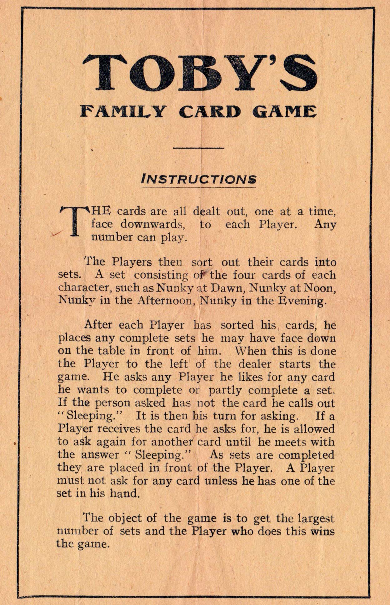 Toby’s Family Playing Cards published by G. Heath Robinson & J. Birch Ltd, London, are a spin-off from the illustrated children’s magazine “Toby” which was published during the 1920s, based on Punch & Judy. (G. Heath Robinson was the younger brother of W. Heath Robinson). The object of the game is to complete the largest number of sets, as explained in the Rules►