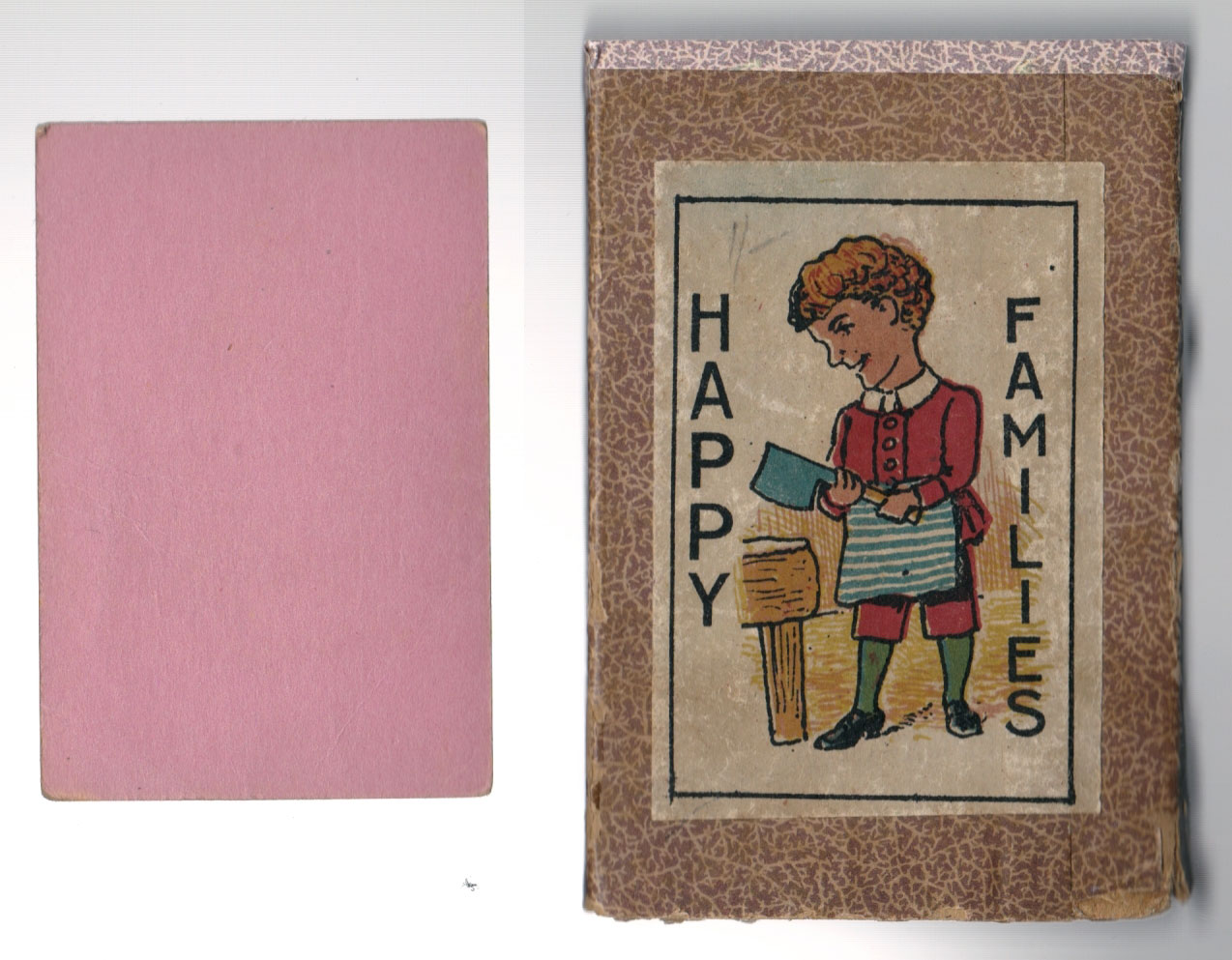 Above: Happy Families set, unknown maker / publisher, 56 cards, square corners, plain pink backs, size of cards = 60mm x 88mm, no identity on the box. A companion Snap game was also published with some of the same characters.