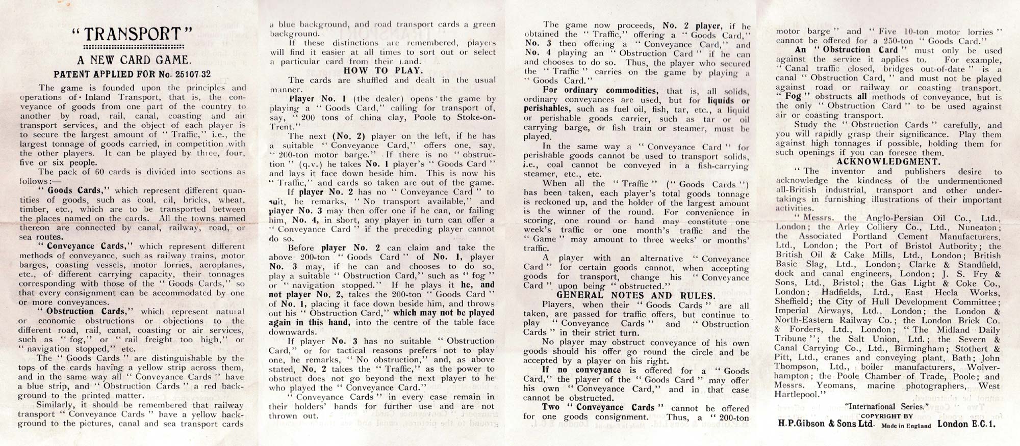 Transport card game published by H.P. Gibson & Sons Ltd in mid-1930s. The game simulates conveyance of goods via various methods of transport (logistics), overcoming obstacles, and the object of the game is to secure the highest tonnage of freight traffic. The cards are divided into sections with different colour backgrounds, etc. The Handley Page HP42 aircraft illustrated (top row) first flew in 1931 so the game is likely to be mid 1930s. See the Rules►