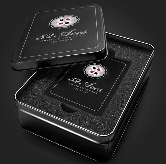 Each card in this pack was individually created by a designer, artist or illustrator in their own distinct style and assembled and published by Zeixs (Cologne) in 2012 in a limited edition of 999 packs. The pack is actually the 2nd edition, and includes 54 different artworks (on 52 playing cards + 2 jokers). This pack is available in two versions: Deluxe Edition in a special tin and Light Edition in a foil laminated cardboard box.