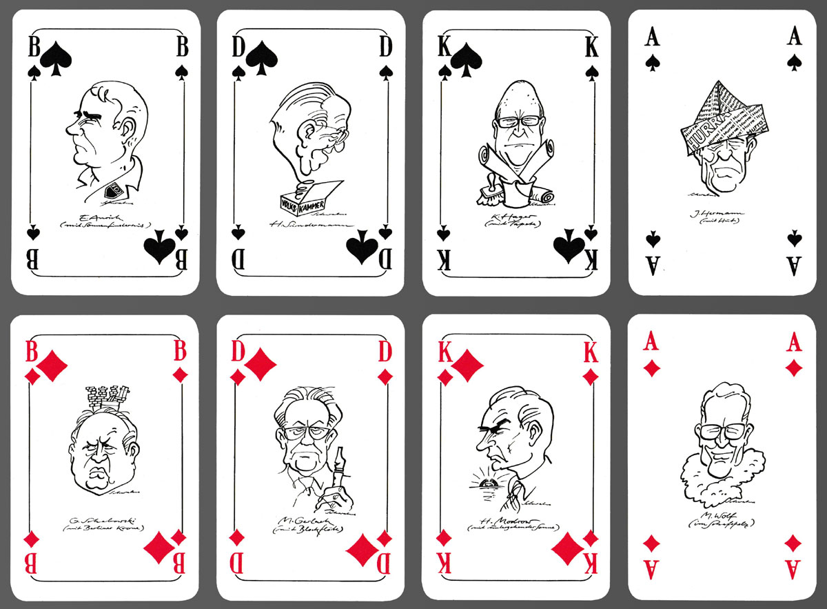 Such a pack as this would have been unthinkable prior to the fall of the Berlin Wall in November 1989 (9-11-89). Just a few months after that historic event this pack was issued, featuring black and white caricatures by Rainer Schwalme of prominent East German politicians from the old regime, notably Erich Honecker on the King of Clubs (and on the title card), Egon Krenz on the Jack of Clubs, and Günter Schabowski (party leader in East Berlin) on the Jack of Diamonds. The manufacturer’s logo appears on the 8 of Hearts. The first edition ran to 8,000 packs; a second edition followed later in a slightly different size.