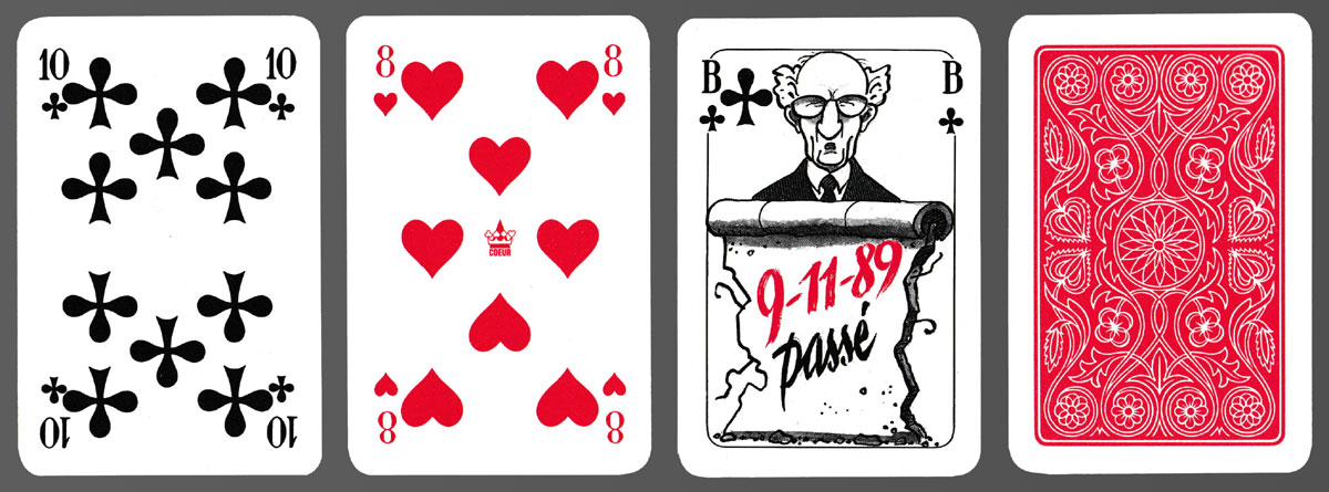 Above: “9-11-89 passé” playing cards made by Altenburger Spielkartenfabrik, Altenburg, Germany, 1990. 32 cards + title card in clear plastic box. Size: 60 x 91 mm (1st edition); 59 x 92 mm (2nd edition).