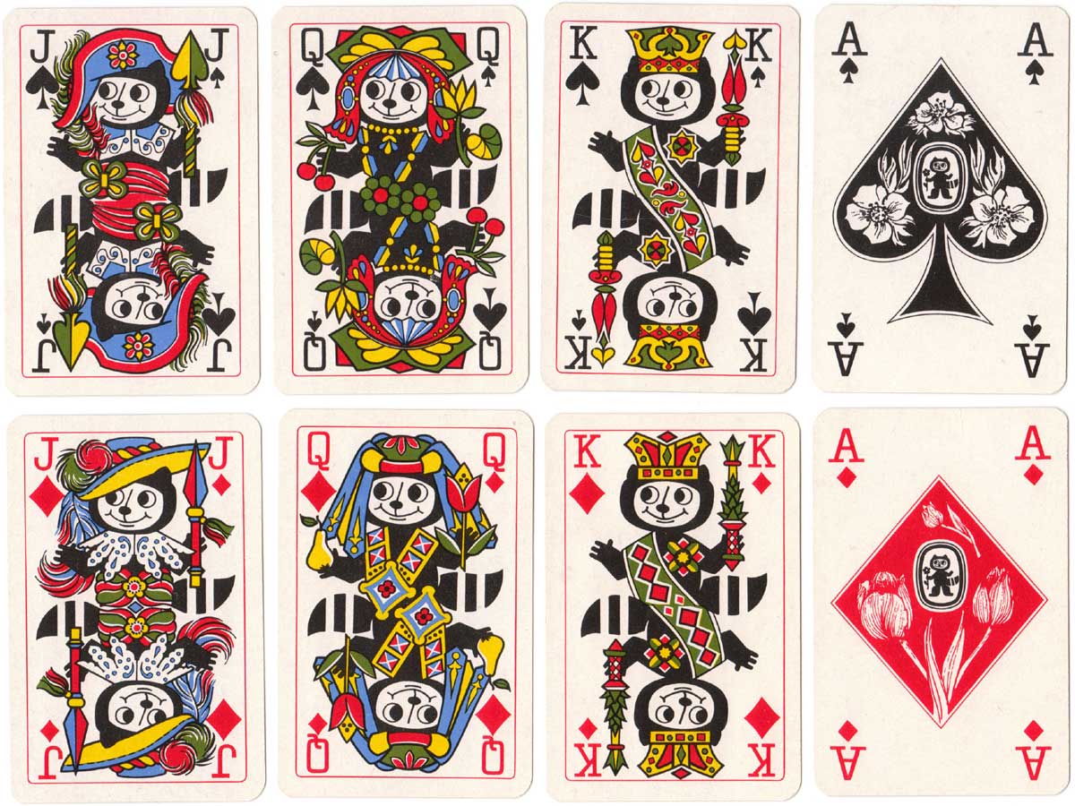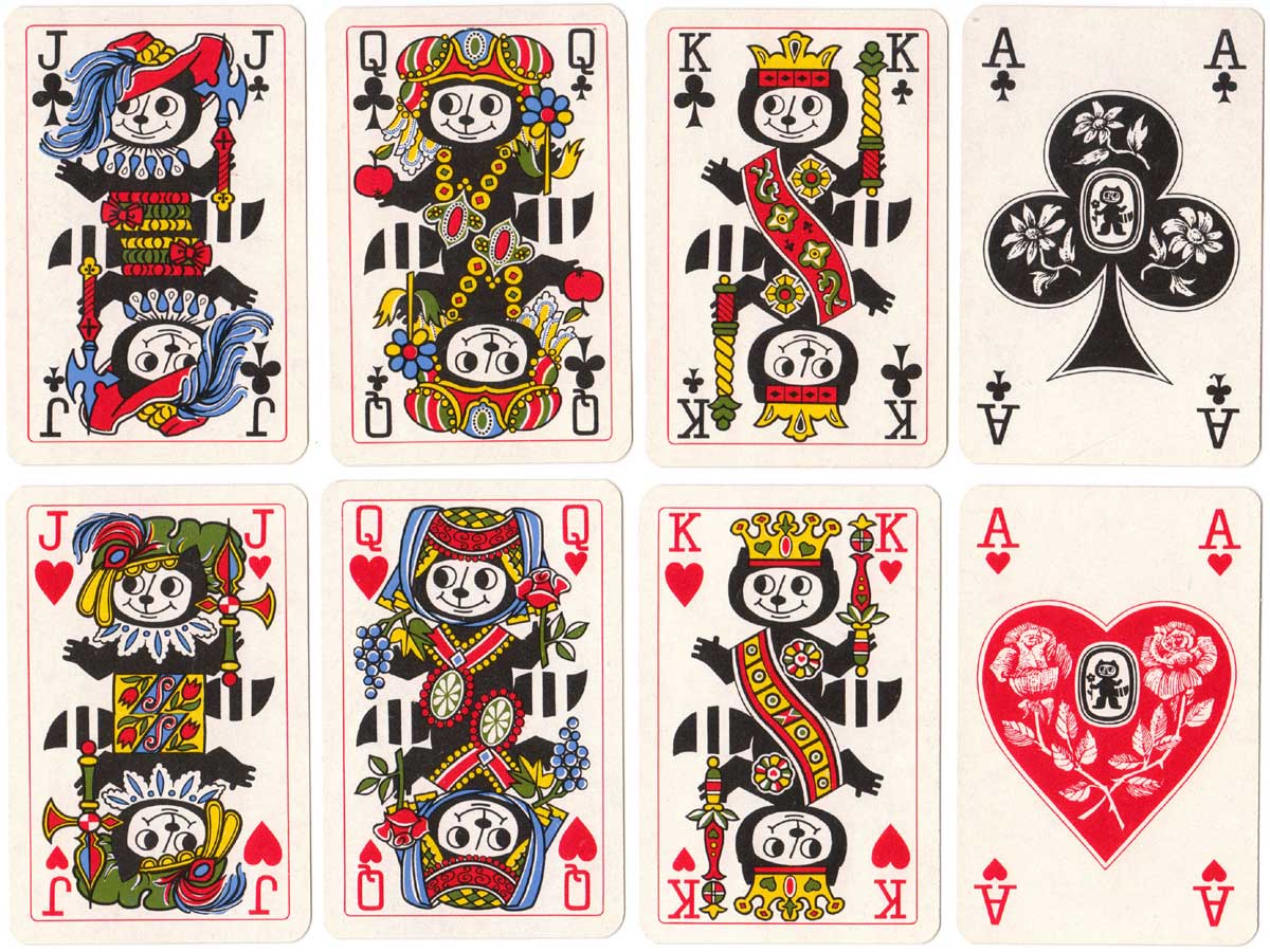 Felix-Karte pack (first issued in 1966) produced by VEB Altenburger Spielkartenfabrik for German textile manufacturers Erste Deutsche Sack-Centrale / DSA Textil Berlin. The court cards, aces and jokers feature cartoons of cute animals (cats) with striped tails.