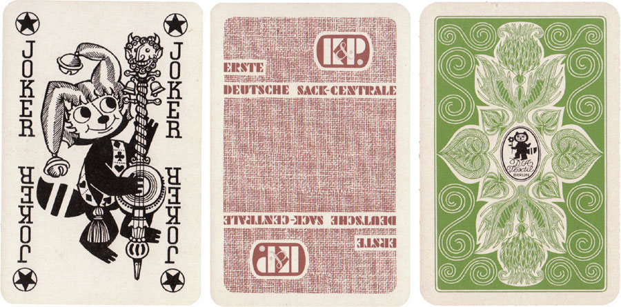 Above: originally called Felix-Karte and issued first in 1966, this is special edition for Erste Deutsche Sack-Centrale / DSA Textil Berlin manufactured by VEB Altenburger Spielkartenfabrik (aka “Cœur”), c.1970. One of the designs has a hessian pattern on the reverse with lettering, the other has "DSA Textil Berlin" in the centre. 52 cards + 3 jokers.