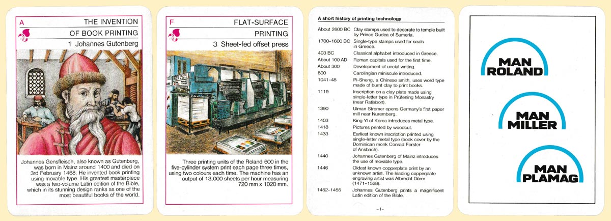 I have another version of this attractive and informative quartet game, with text in English. The backs carry an advertisement for Man Roland (later Manroland), renowned manufacturers of printing presses. On the bottom flap of the box it states "Copyright: Gutenberg Verlag Leipzig" and "Printed by: Altenburger Spielkartenfabrik GmbH". That styling of the manufacturer's name was used between 1991 and 1995 so it may well be that the English-language version came after the German one. See the box►