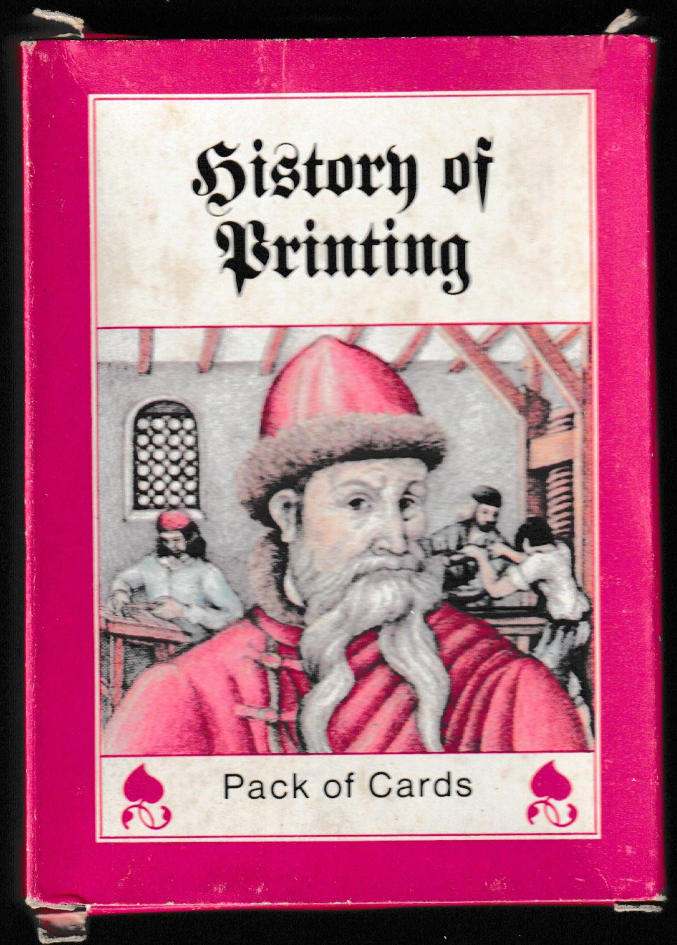 Above: Geschichte des Buchgewerbes quartet game published by Verlag für Lehrmittel Pößneck, manufatured by Altenburger Spielkartenfabrik, c.1989. The illustrations convey information about the invention of the art of printing, the original graphic arts, typesetting, reproduction techniques, printing processes (letterpress, flat printing, gravure) and bookbinding. The card backs are decorated with pink fleurons (also known as printer's flowers). 32 cards + 4 information cards in box.