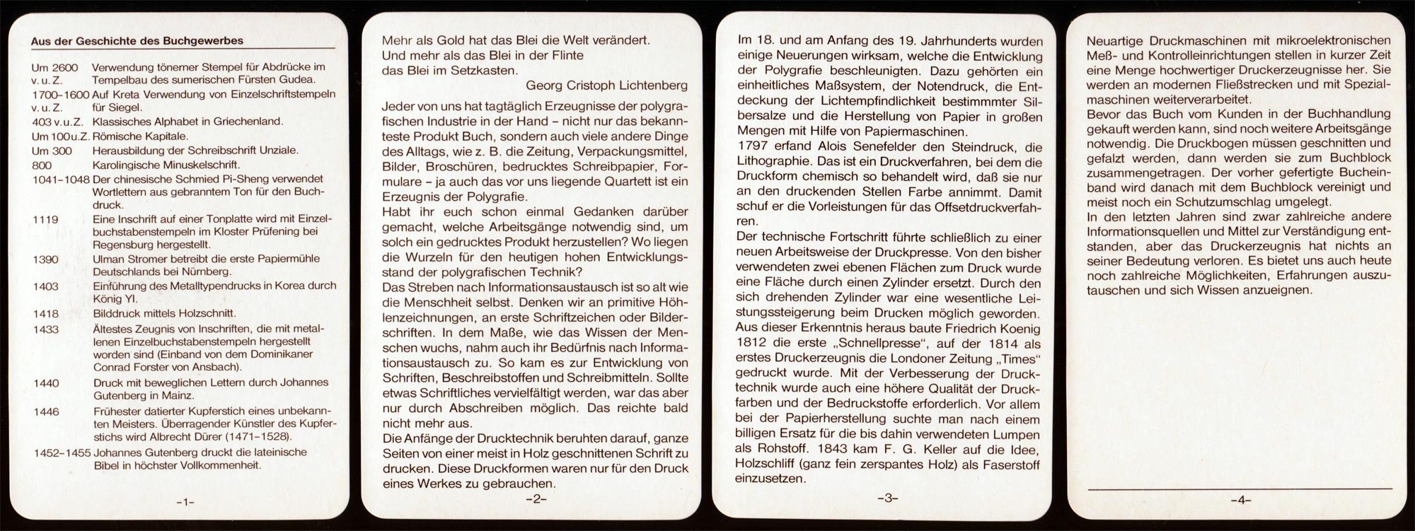Geschichte des Buchgewerbes (History of the book trade) educational quartet game published by Verlag für Lehrmittel Pößneck. The illustrations, by Ludwig Winkler, are in sets of four showing the development of the book trade from the creation of writing to the gravure printing process. See the information cards►