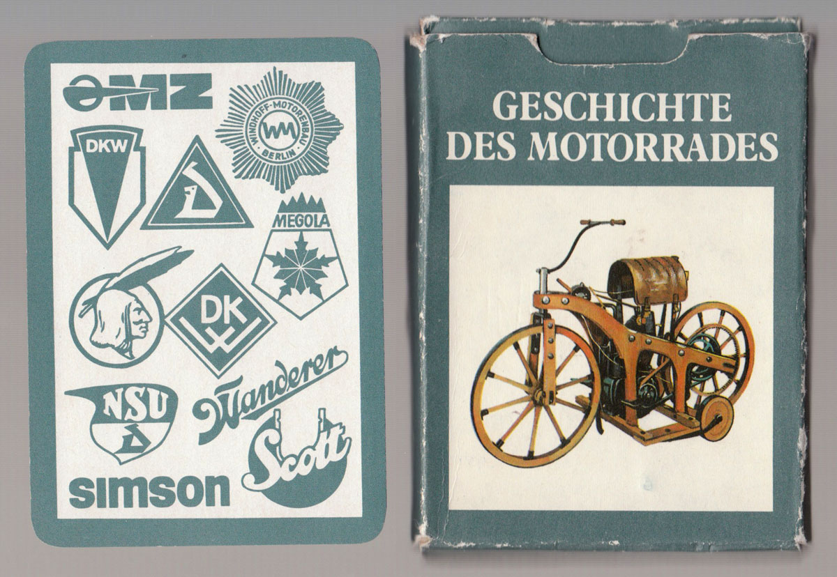 Above: Geschichte des Motorrades published by Rudolf Forkel, Verlag für Lehrmittel Pößneck, manufatured by Altenburger Spielkartenfabrik, c.1989. 32 cards + 3 instruction cards in box.