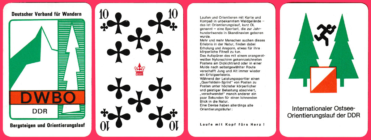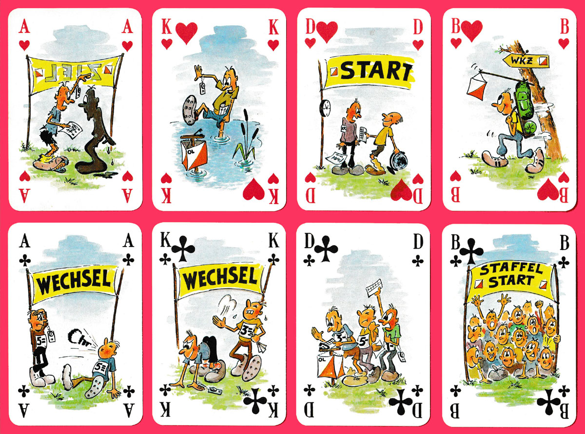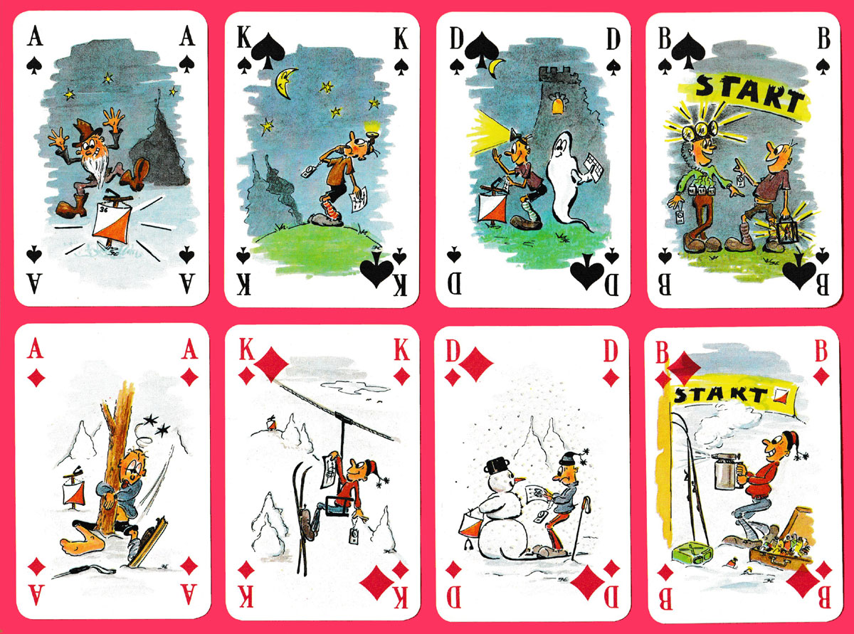 All the court cards and Aces in this French-suited pack have humorous designs by Helmut Härtelt (with final artwork by Helge Männe) on the subject of orienteering. These include scenes at night (spades) and antics in the snow (diamonds). The manufacturer’s logo appears on the 10 of Clubs. Note that the design on the back of the extra card is different from the rest of the pack but in the same colours. This was an edition of 4,000 packs.