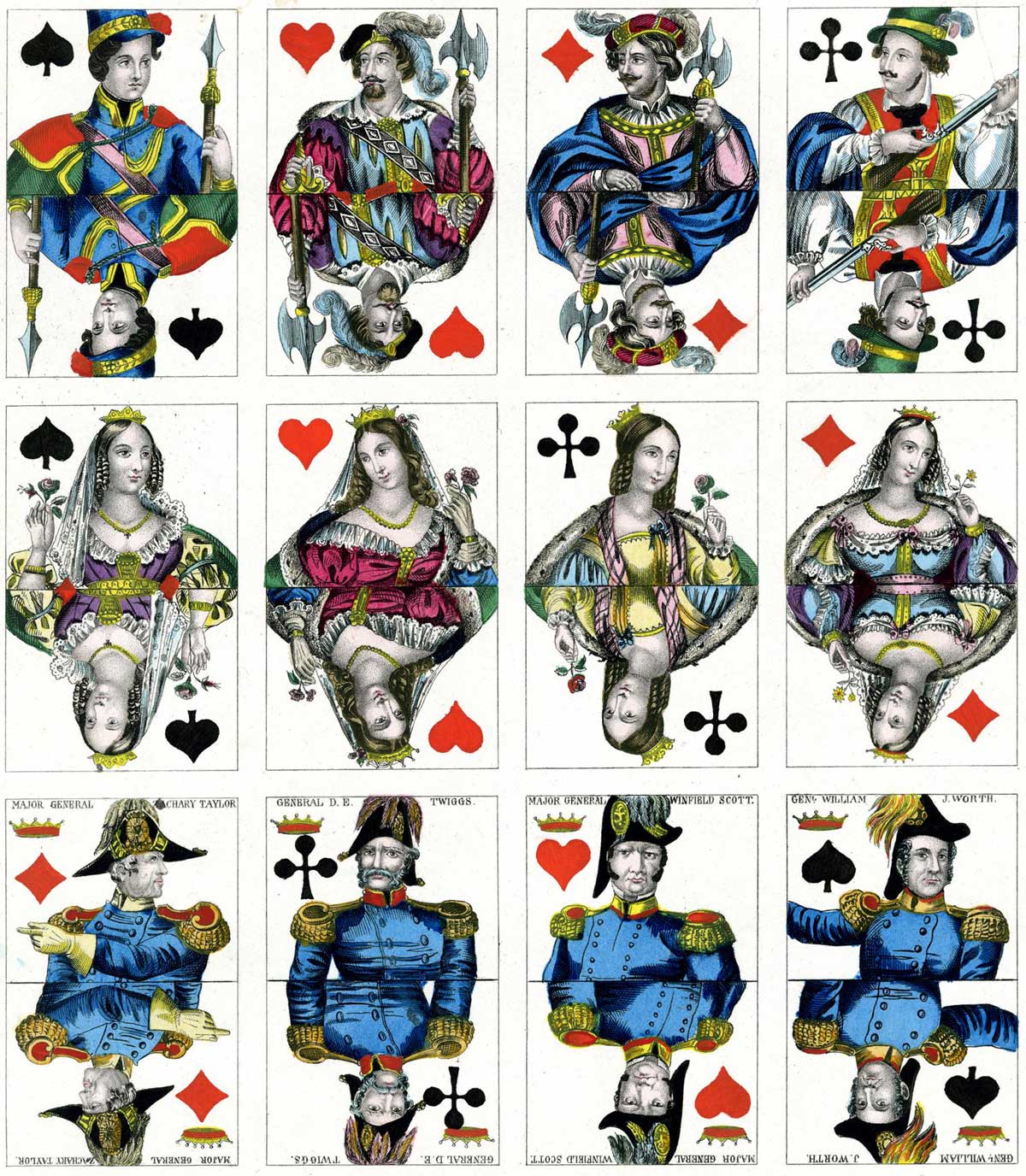 Above: the twelve double-ended court cards from a set issued at Frankfurt depicting incidents in the Mexican-American war on the aces. Only the four kings are named: Major General Zachary Taylor, General D.E. Twiggs, Major General Winfield Scott and General William J. Worth. Museum Number 1896,0501.1194.