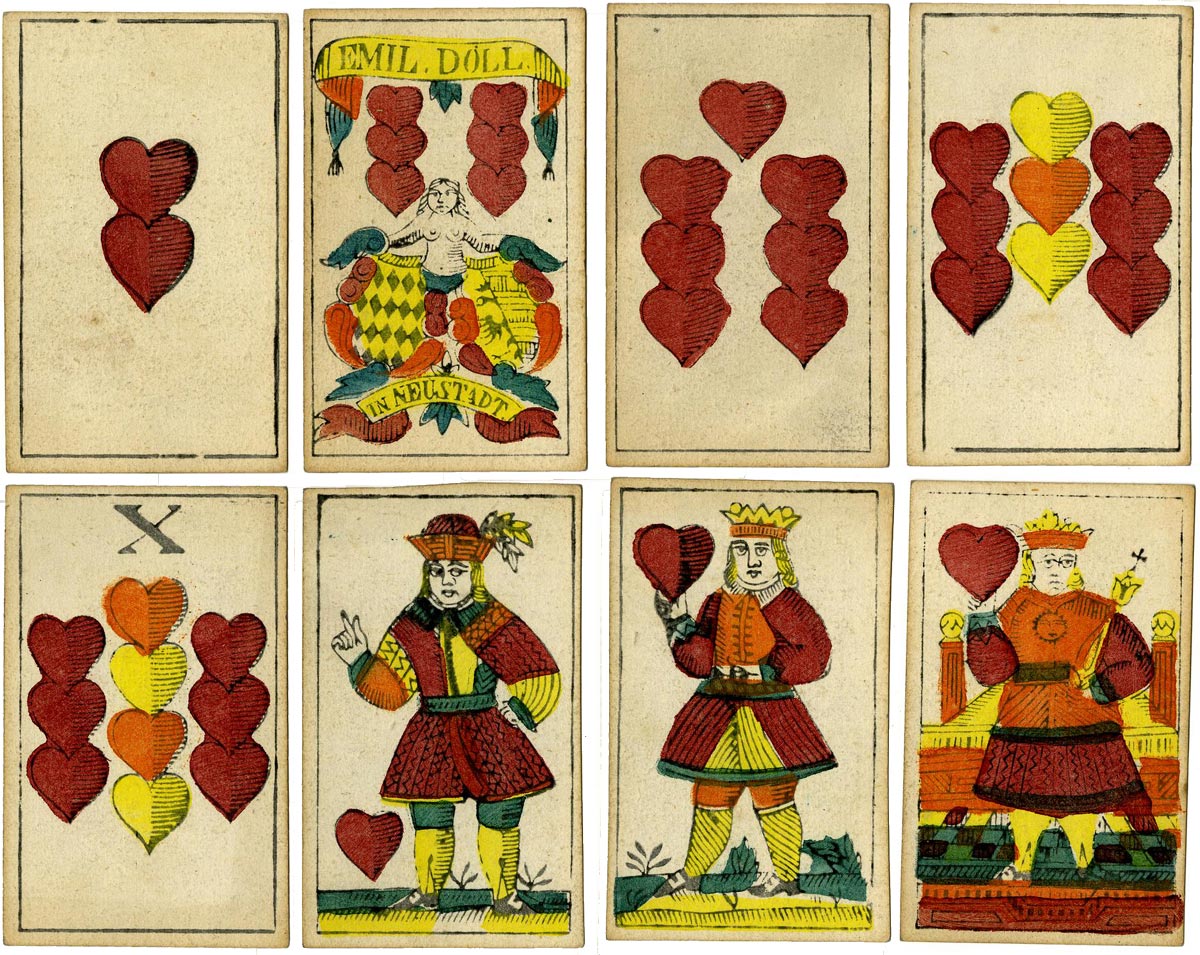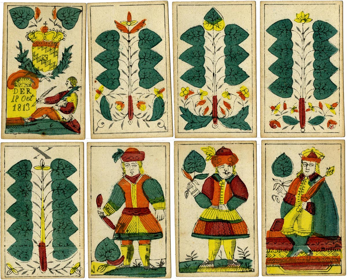 The Ansbach pattern retains features from the earliest (medieval) days of cardmaking. The designs are pleasingly simple and non-military: only the upper knave of acorns carries a weapon. The format of the later Nürnberg or Ansbach pattern, like this example, is narrower than earlier ones. The 6 of hearts has the arms of Bavaria and Nürnberg with “Emil Doll in Neustadt” in decorative scrolls, supported by a naked figure. The deuce of leaves also has the arms of Bavaria with someone writing on a tablet “Der 18 Oct. 1813” (the date of the battle of Leipzig); the deuce of acorns has the Bavarian lion supporting the arms of Nürnberg with an empty scroll at the top. There are no vignettes on any of the other pip cards. The backs are decorated with a pattern of black crosses.