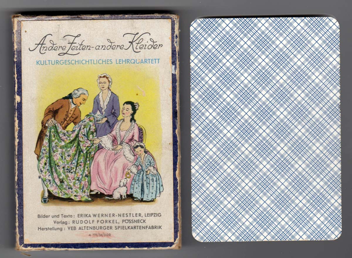 Above: ‘Andere Zeiten - Andere Kleider’ cultural history quartet game designed by Erika Werner-Nestler, published by Verlag Rudolf Forkel, Pössneck, manufactured by VEB Altenburger Spielkartenfabrik, 1954, 1961. 36 cards + booklet in box.