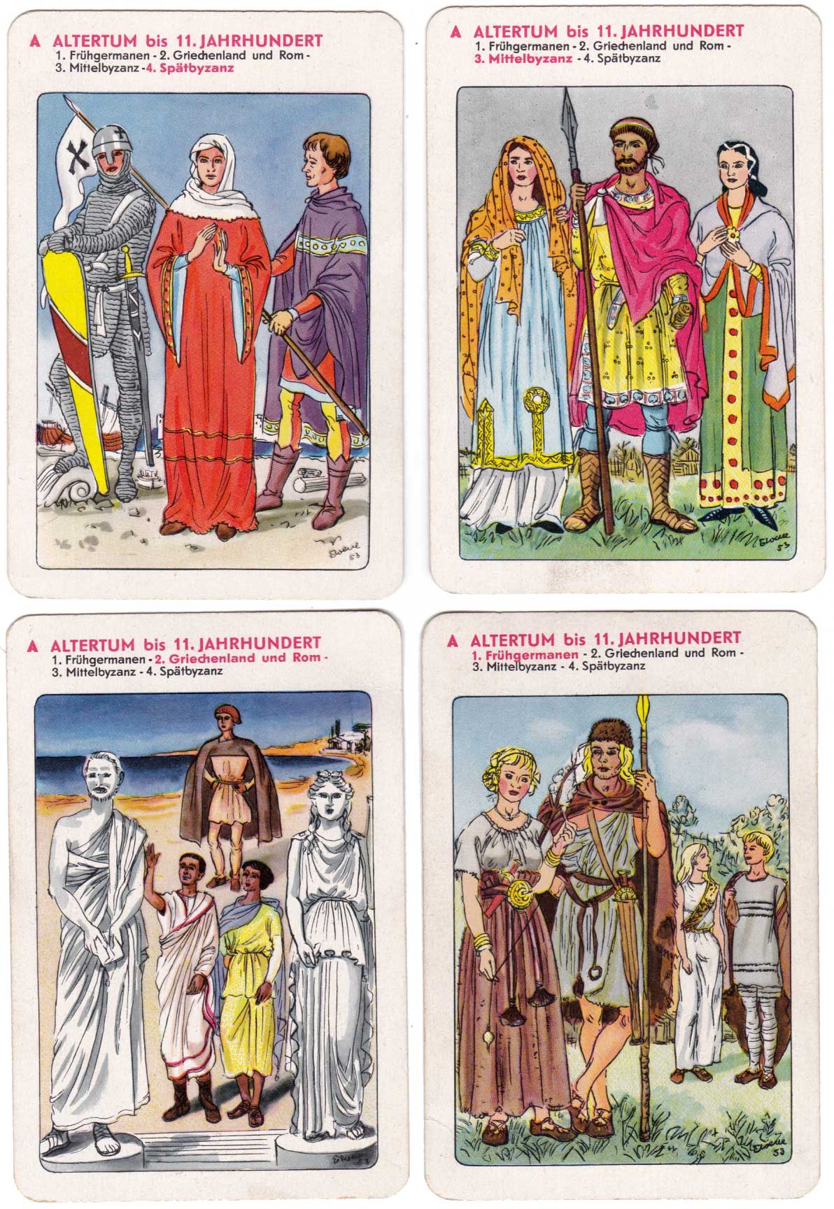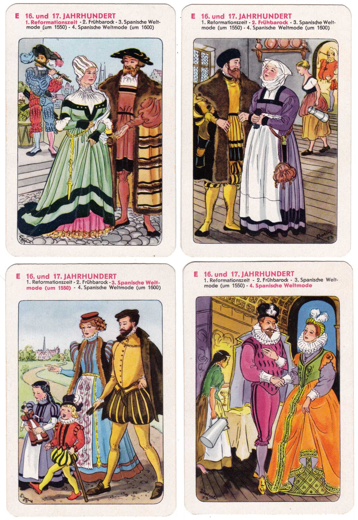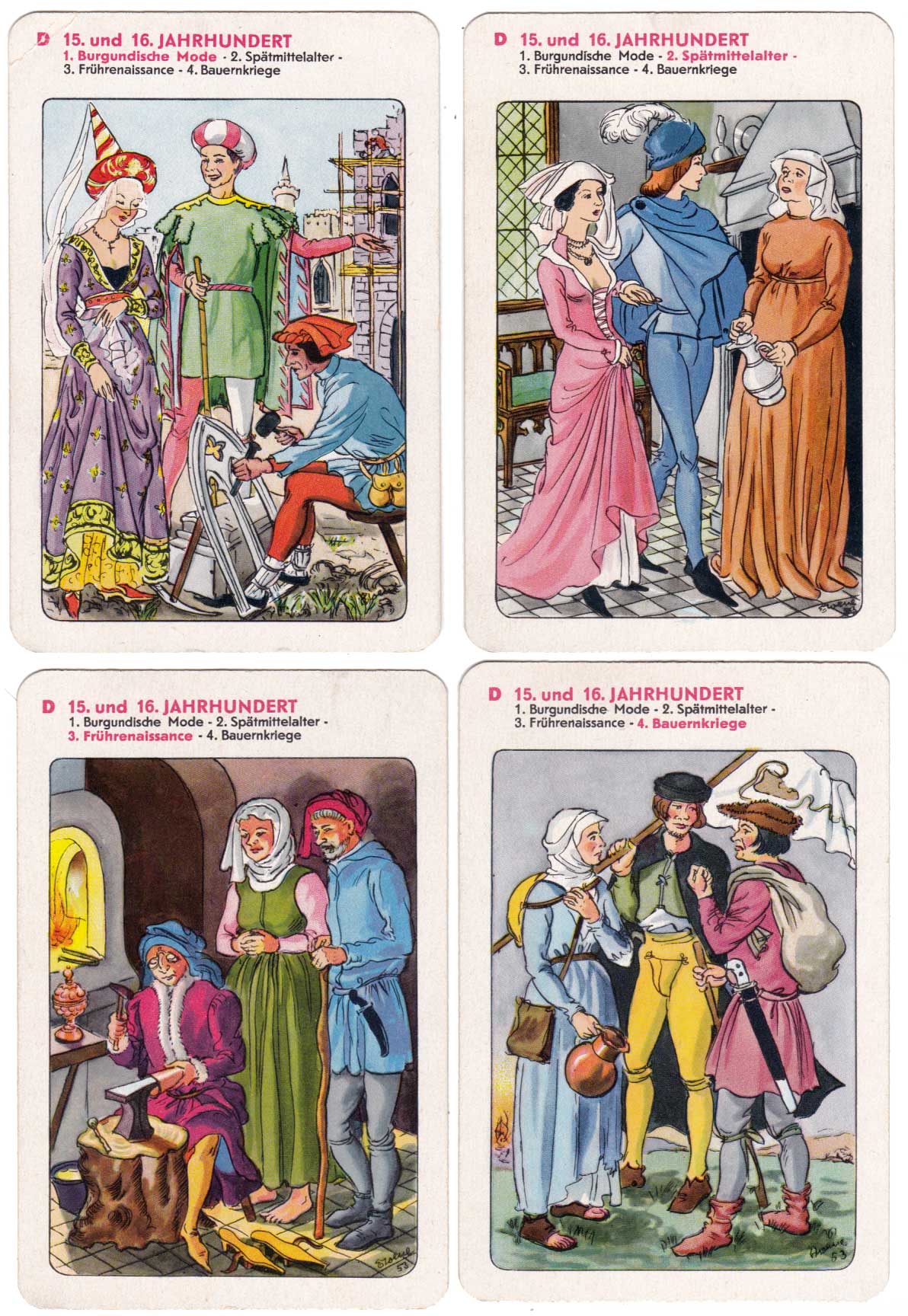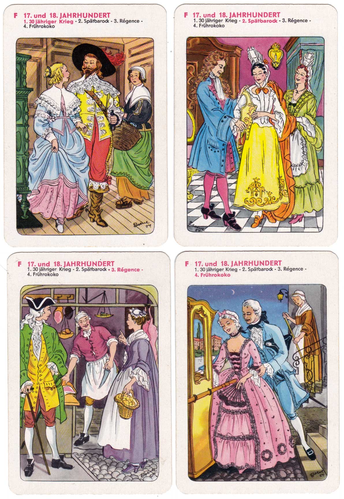 History of fashion educational quartet game showing European clothing through the ages, designed by Erika Werner-Nestler, published by Rudolf Forkel, Pössneck, 1954.