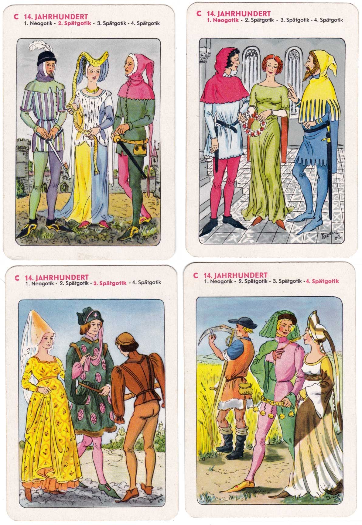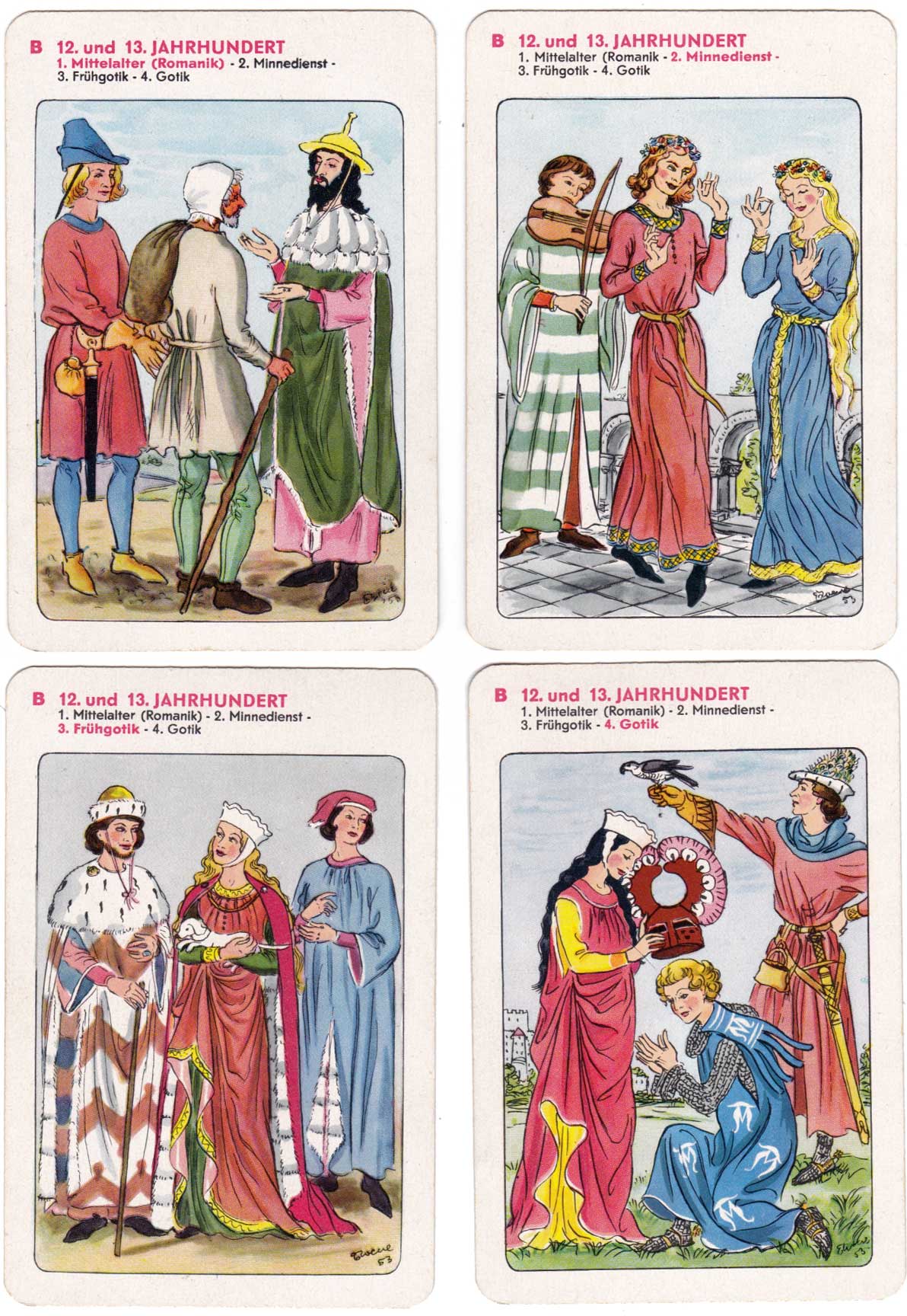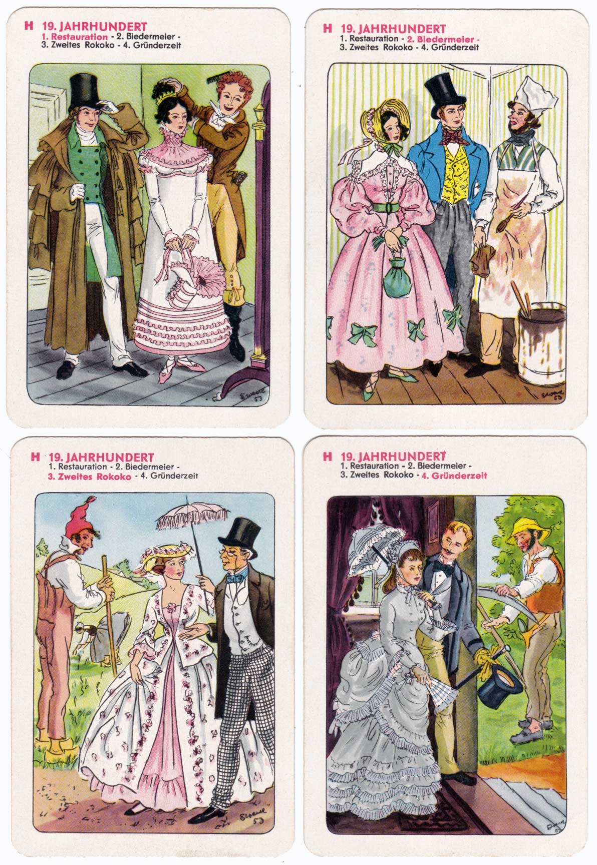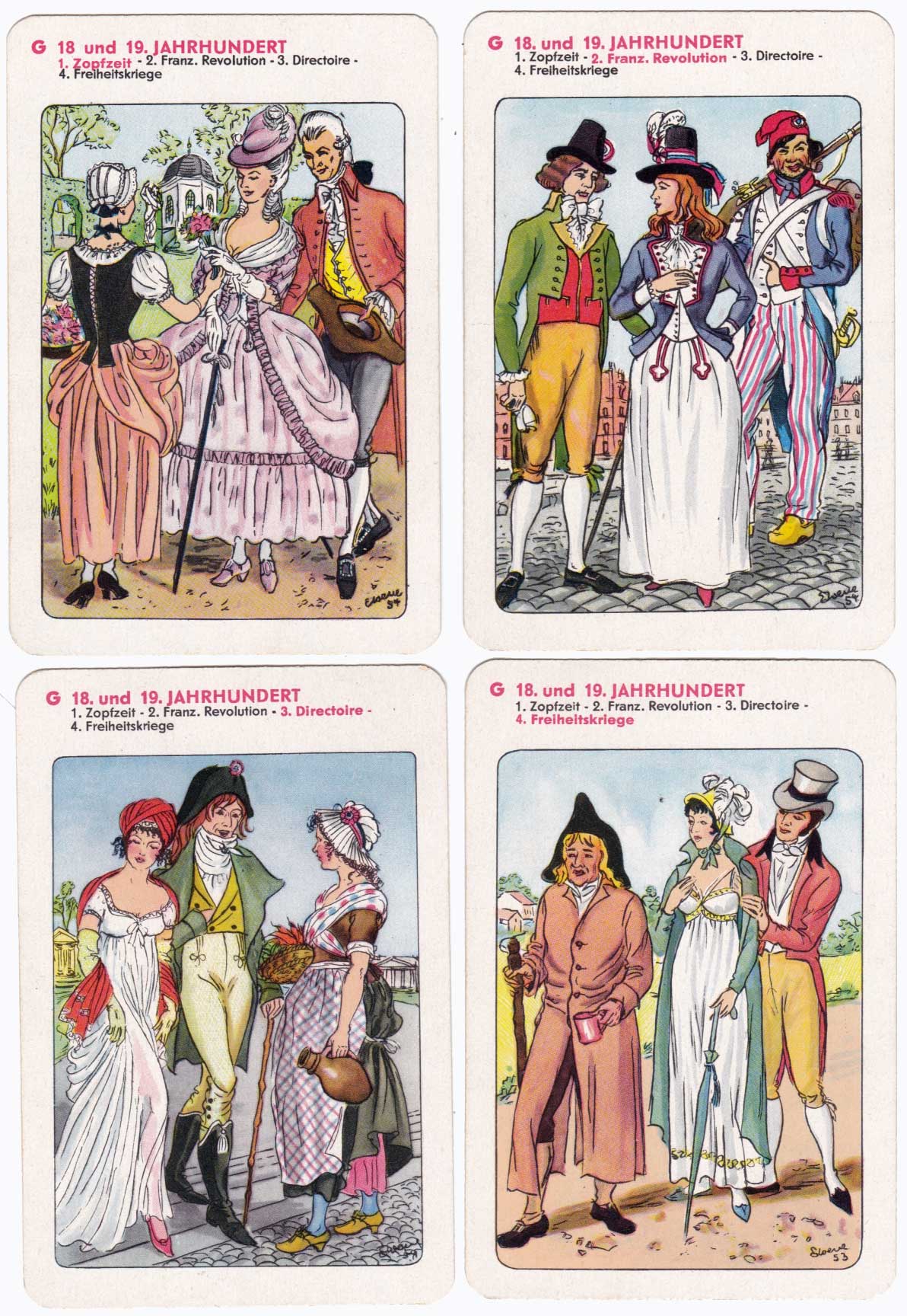 History of fashion educational quartet game showing European clothing through the ages, designed by Erika Werner-Nestler, published by Rudolf Forkel, Pössneck, 1954.