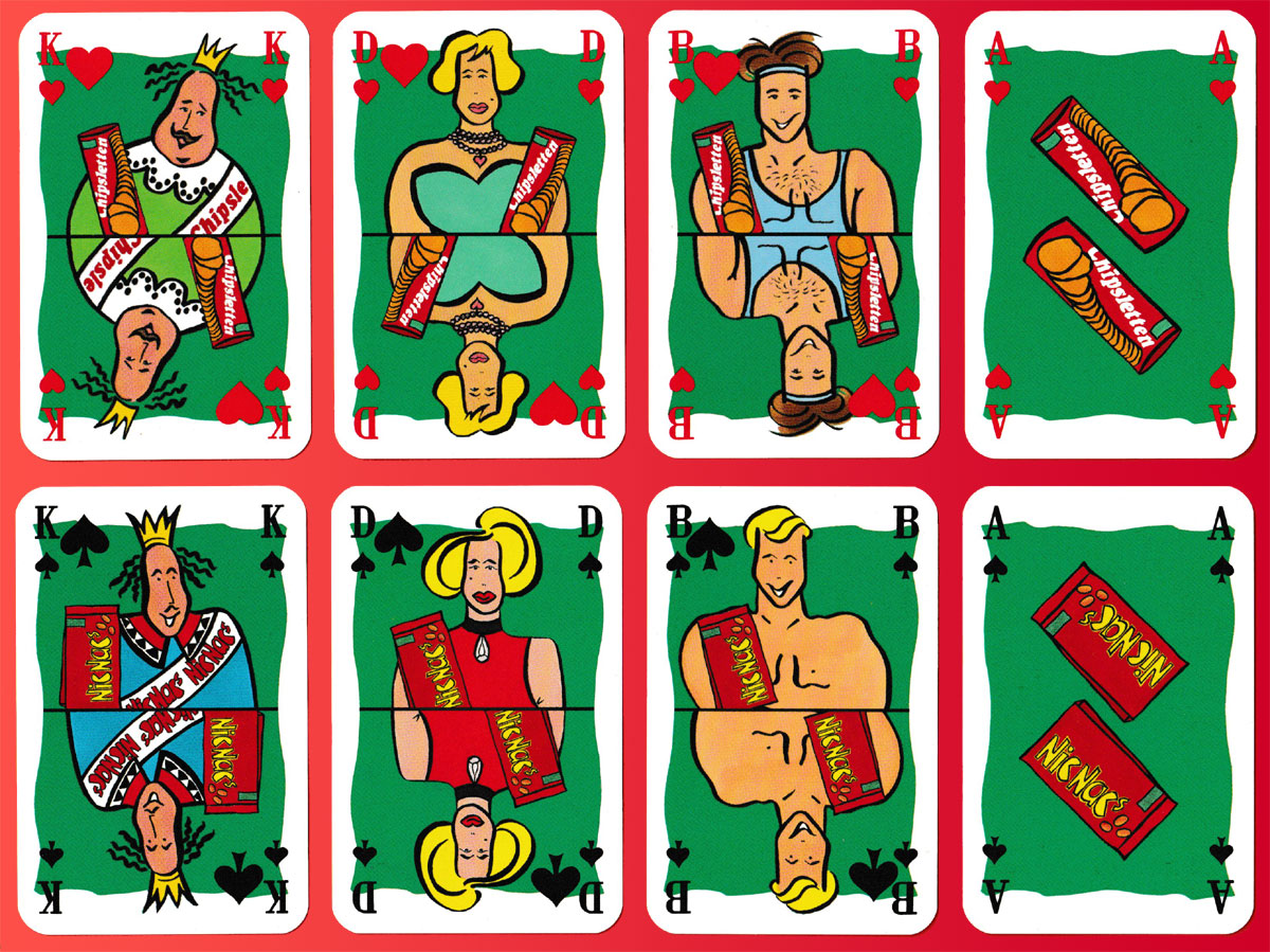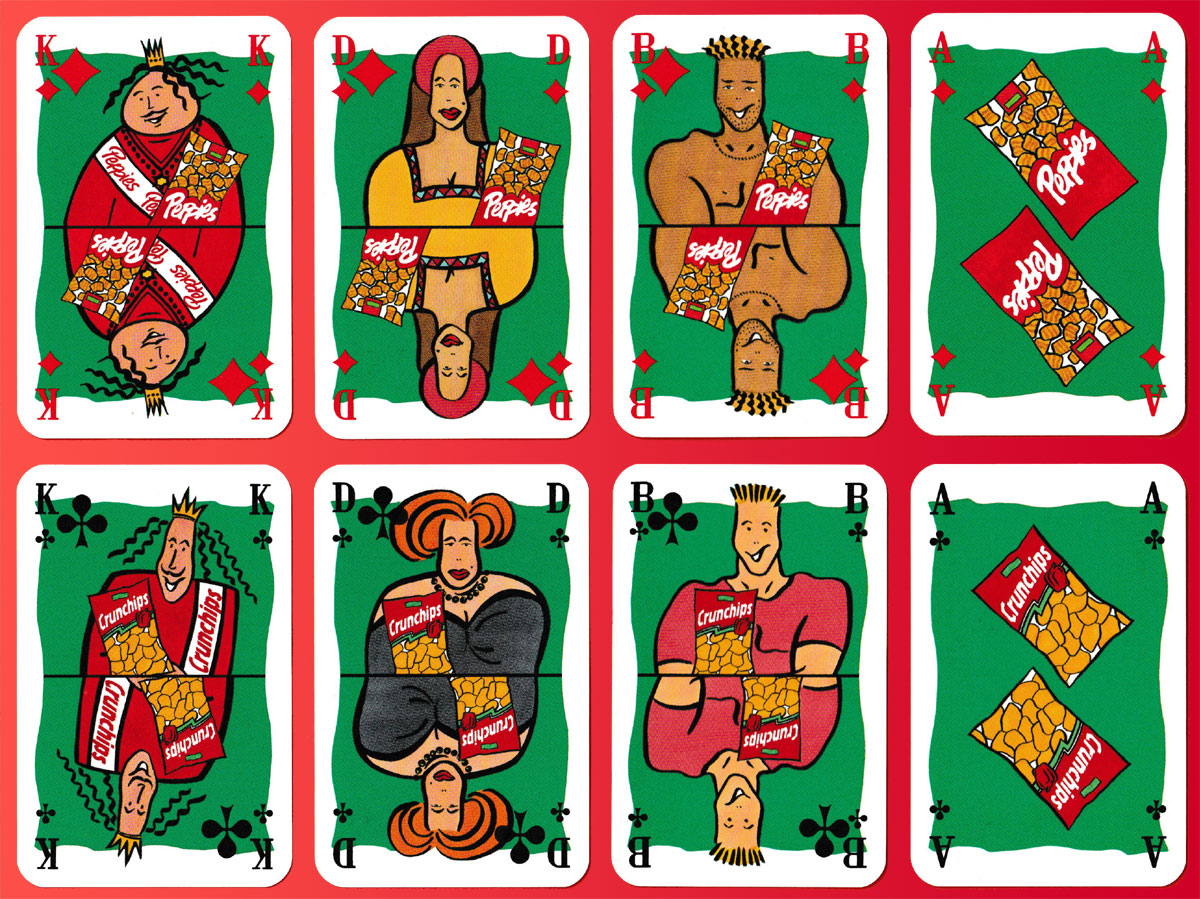 Founded in 1889, Bahlsen is a family-owned German food company producing a range of biscuits and cakes. Four of their snack products are featured here, one per suit. The courts have been drawn in a comic style with the products in the foreground. Like the Aces, they are set against a green background. Bahlsen exports its products to about 55 countries.