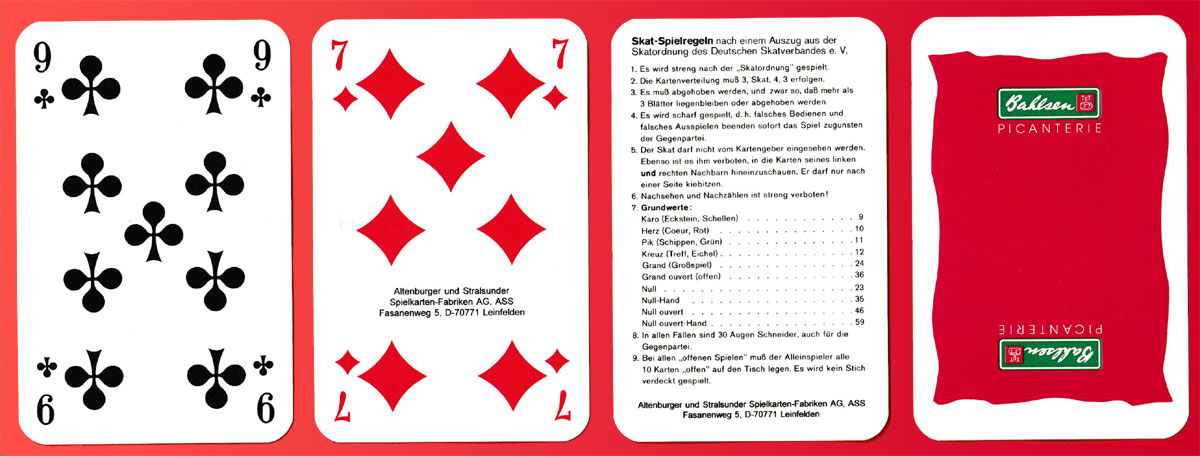 Above: Bahlsen Skat printed by A.S.S., Leinfelden, Germany, c1995. 32 cards + 1 extra card (with rules for Skat in German) in clear plastic box. Size: 59 x 91 mm.