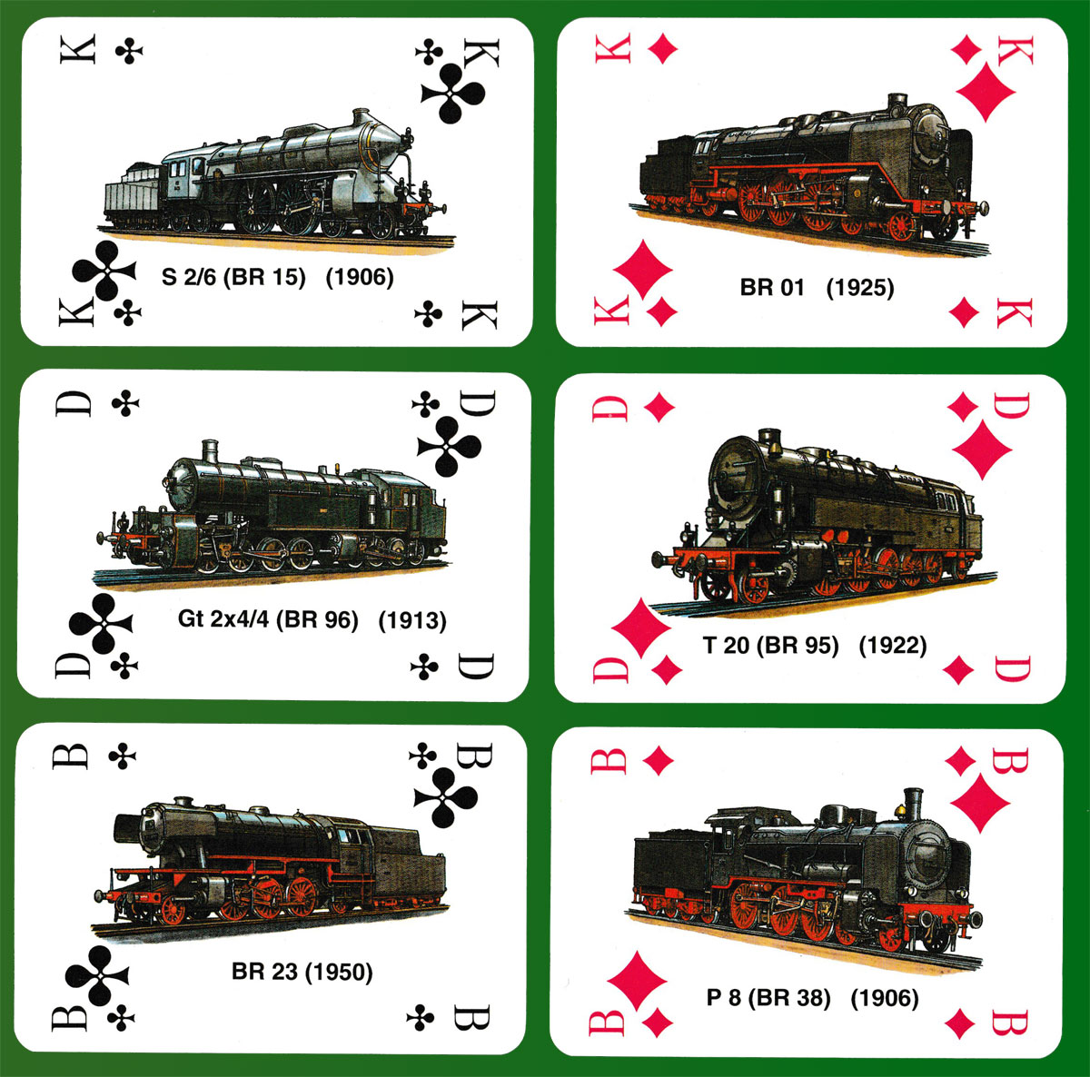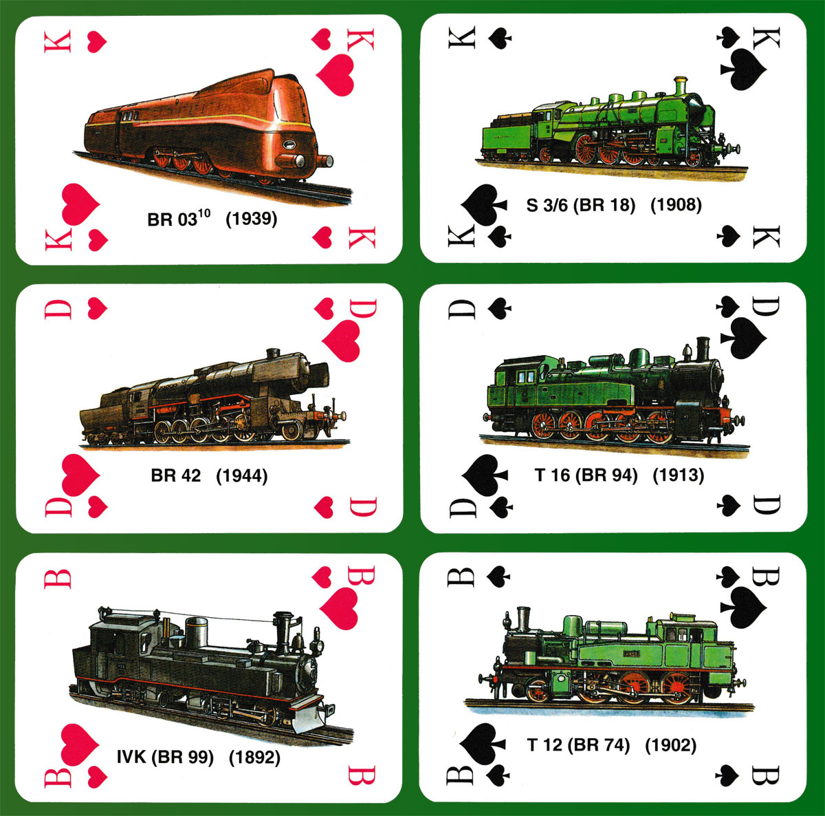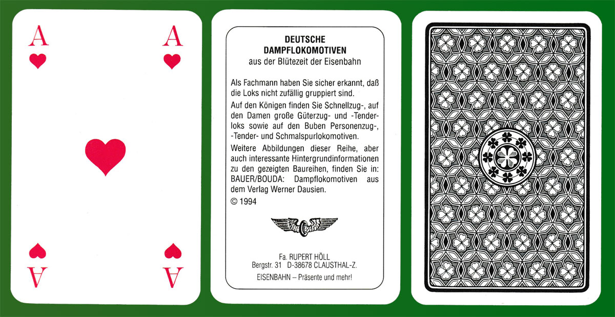 Above: Deutsche Dampflokomotiven (steam locomotives) playing cards made by Altenburger Spielkartenfabrik GmbH, Altenburg, Germany, for Rupert Höll, Clausthal-Zellerfeld, Germany, 1994. 32 cards + 1 extra card with text in German, in plastic box. Size: 59 x 92 mm.