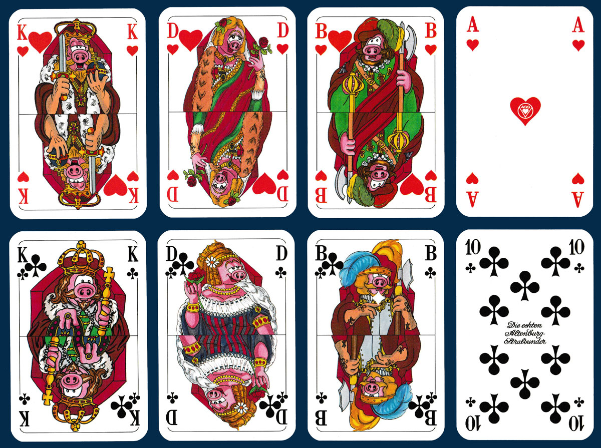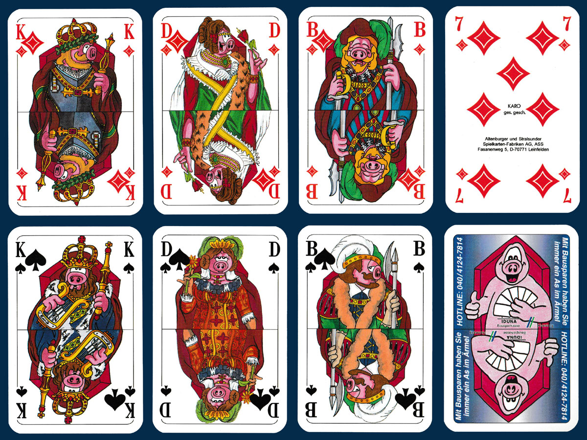 Presumably pigs feature prominently in this pack because of the traditional association of pigs with saving money (as in ‘piggy banks’). The non-standard court cards depict rather ugly pigs heavily disguised to look something like standard Berliner pattern courts. There is a slogan for the building society on the back which translates as something like “With home savings you always have an ace up your sleeve”.