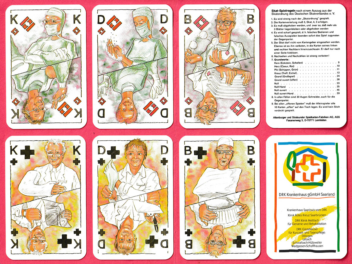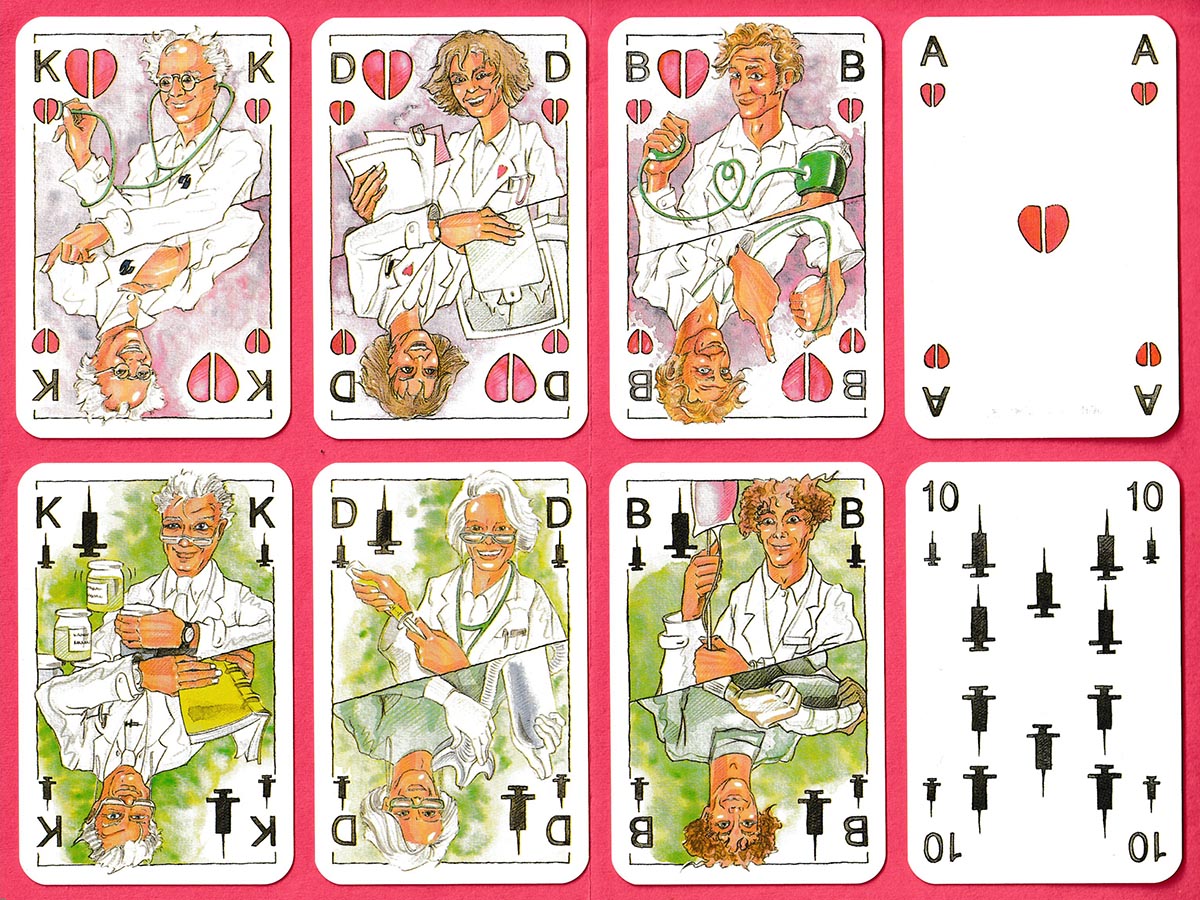 They say that laughter is the best medicine. Clearly the medical team going about their daily tasks on this set of courts is a happy and contented one! A couple of the doctors and nurses wear medical face masks (echoed in 2020 on the Covid-19 pack). What makes this 32-card pack for skat all the more fun is that the suits are non-standard – syringes, plasters, ‘real’ hearts – and the two ends of each court card are different. In addition, Detlef Krause has used a range of pastel colours in his drawings which adds to the overall softness of the designs. Different back designs were issued: this one is for a hospital group in the Saarland.