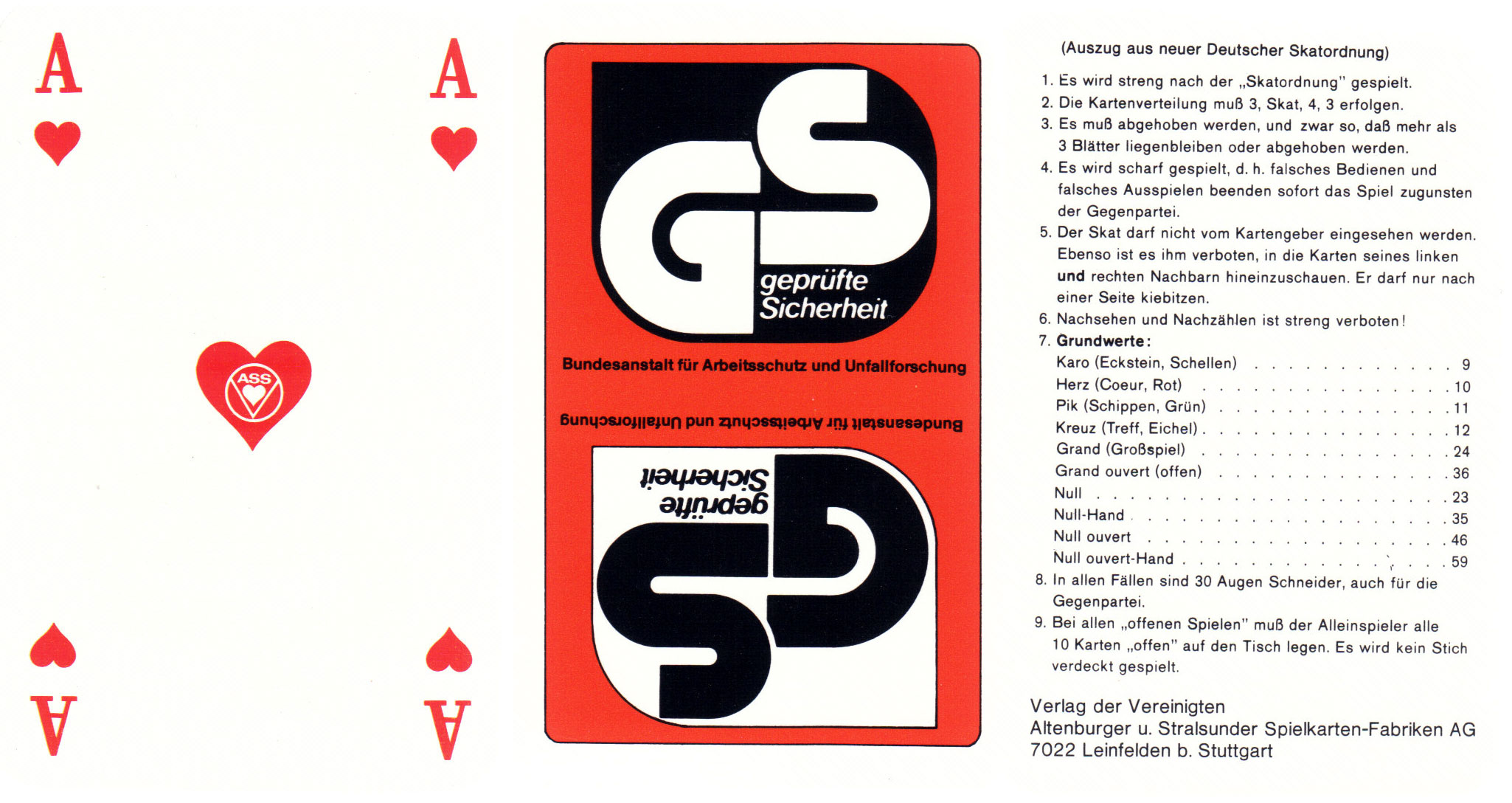 Above: Skat deck made specially for Bundesanstalt für Arbeitsschutz und Unfallforschung (Federal Institute for Occupational Safety and Accident Research) Dortmund, 1978. The reverse has the slogan "Geprüfte Sicherheit" (Certified Safety). Images courtesy Rex Pitts.
