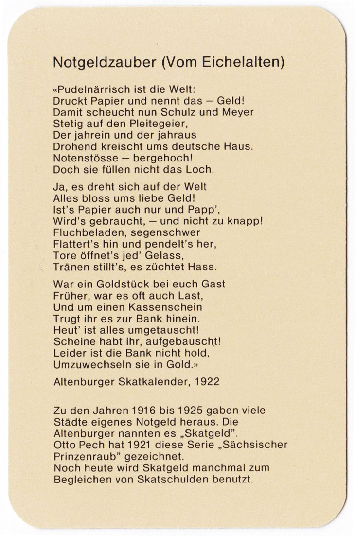 Between 1916 and 1925 many cities issued their own emergency money. This “Original Skatgeld der Stadt Altenburg” card game features the emergency money of 1921 designed by Otto Pech ("Pix”). See the Extra Card►