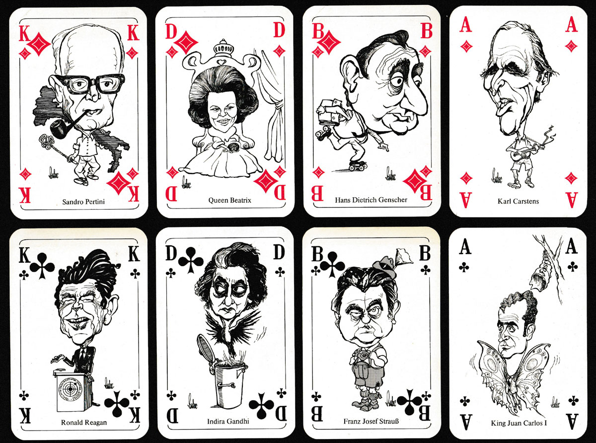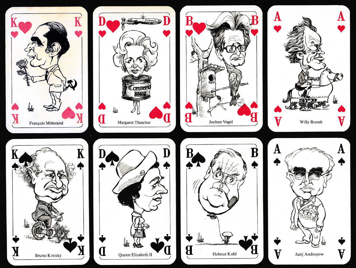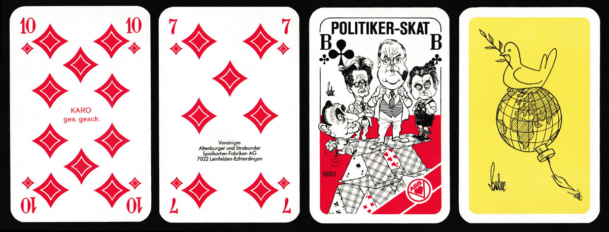 Of the several packs with caricatures of heads of state and senior politicians by the German caricaturist known as Bubec (real name Lutz Backes, b. 1938), this is the only one created for the German market. The pack has indices in German and includes six prominent German politicians of the period, namely Jochen Vogel, Willy Brandt, Helmut Kohl, Hans Dietrich Genscher, Karl Carstens and Franz Josef Strauss. On the Ace of Spades is Yuri Andropov (or Jurij Andropow) who died in February 1984, having led the Soviet Union for only about 15 months. François Mitterrand’s surname is incorrectly spelt “Mitterand”. The manufacturer’s name appears on the 7 of Diamonds. The styling of the diamond suit-signs is typical of an A.S.S. production. The back design is common to all the packs in this series but this is the only one set on a yellow ground.