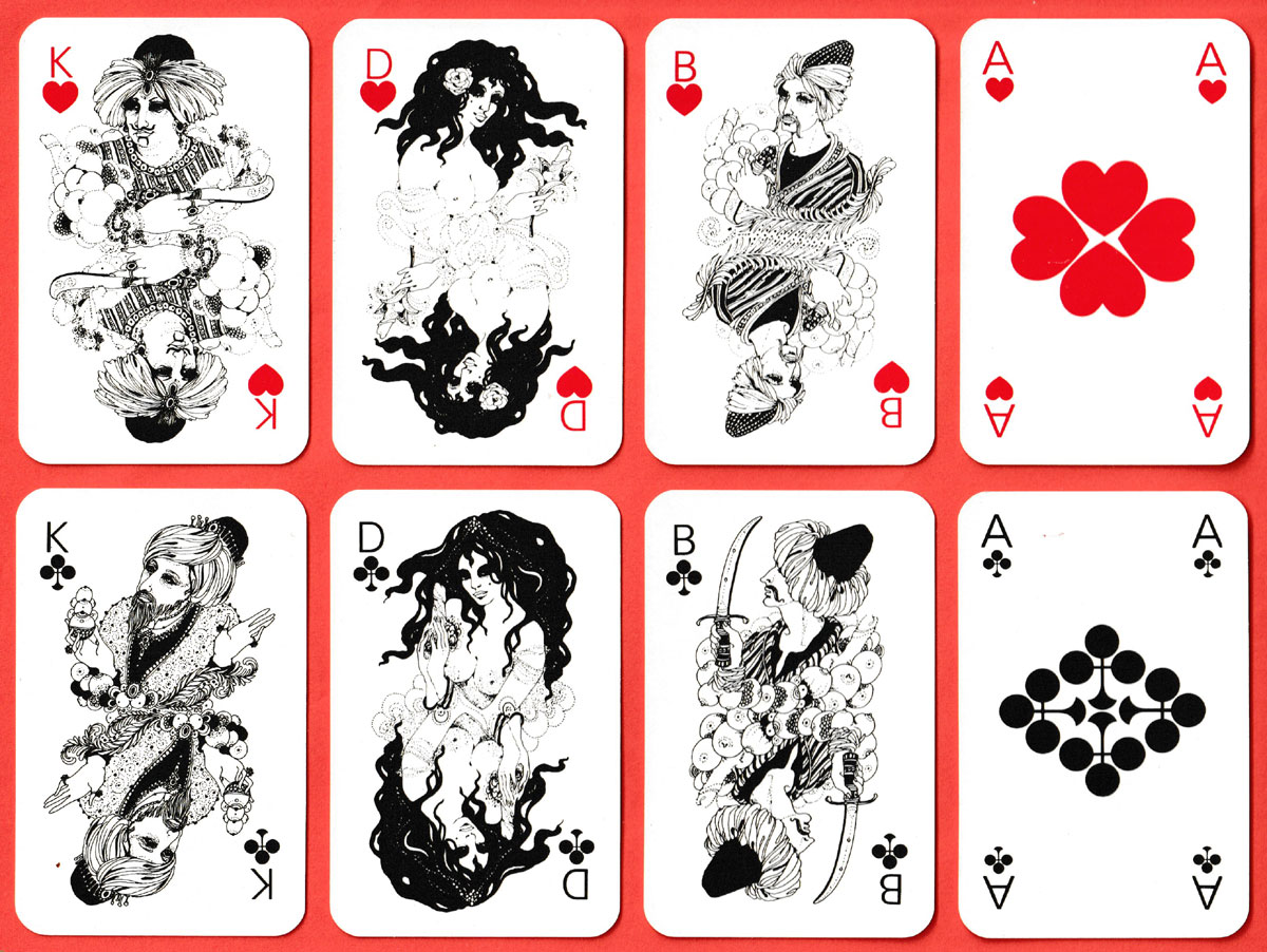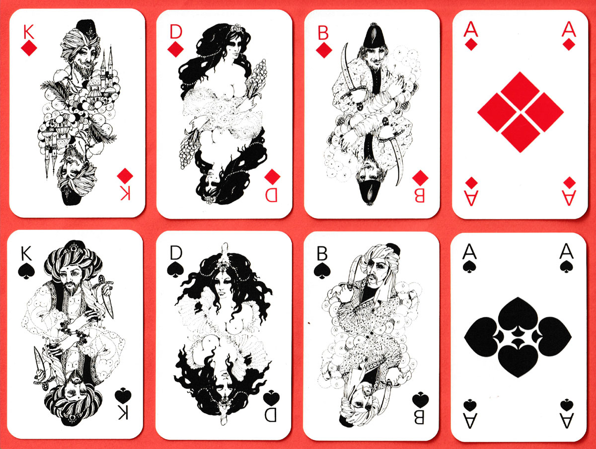 The court cards in this pack show figures from the collection of folk tales called “One Thousand and One Nights”. The double-ended designs are in black and white only. The suit-signs on the pip cards have been redesigned. The indices are in German (curiously, in two corners only on the court cards but in four corners on all the other cards). The name of the bookshop appears on the back along with a collection of suit-signs in black on white.