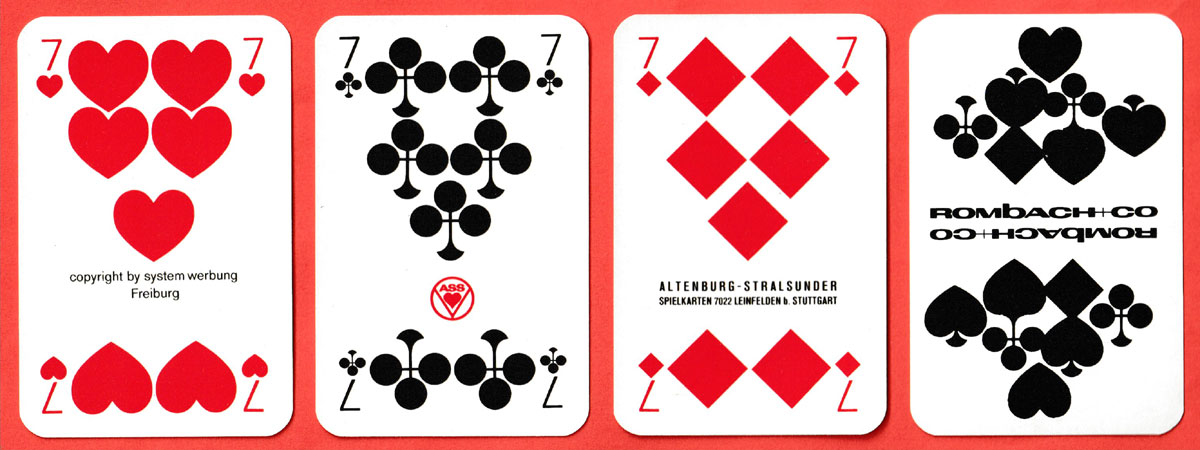 Above: Rombach + Co Skat bookshop publicity playing cards designed by Uschi Dorner. Printed by A.S.S., Leinfelden, Germany, 1972. 32 cards in clear plastic box. Size: 59 x 91 mm. Copyright by System Werbung, Freiburg.