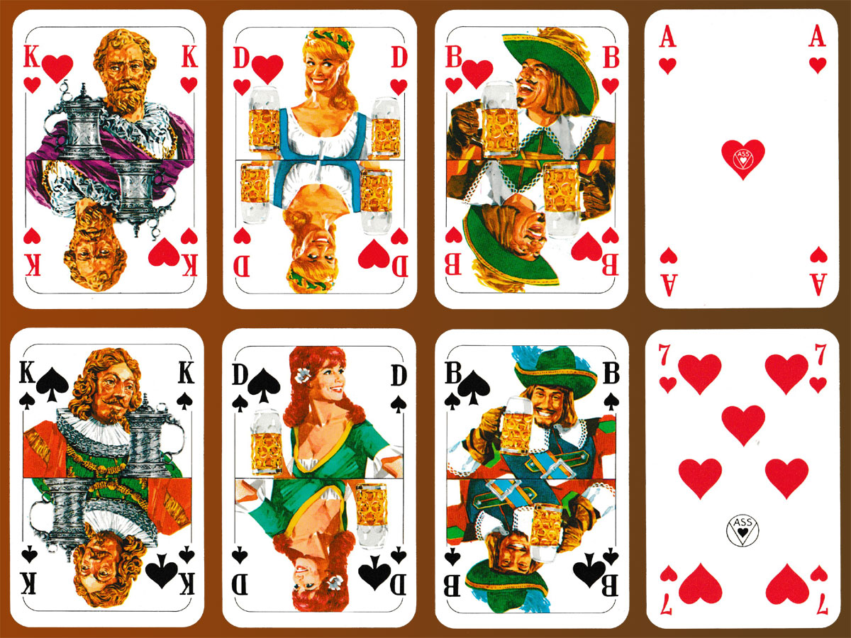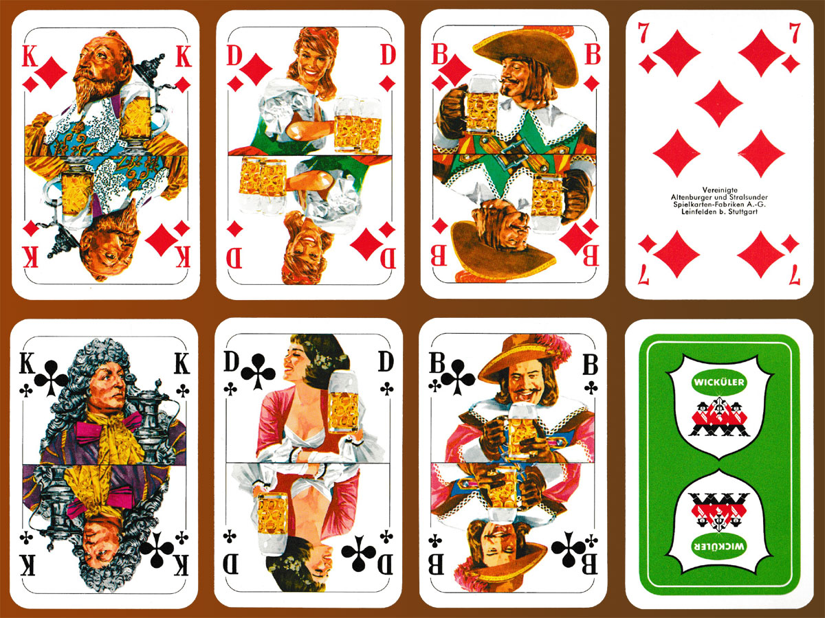 The Wicküler beer brand dates back to 1845. However, Wicküler ceased to be an independent brewery in the 1990s. The Kings are based on historical figures (e.g., Gustav II Adolf of Sweden on the King of Diamonds). Each is depicted with a stein. The Queens are jolly serving wenches, while the Jacks are merry musketeers, each with a beer mug or two. The name of the brewery together with their logo (three musketeers) appears twice on the reverse against a green background.