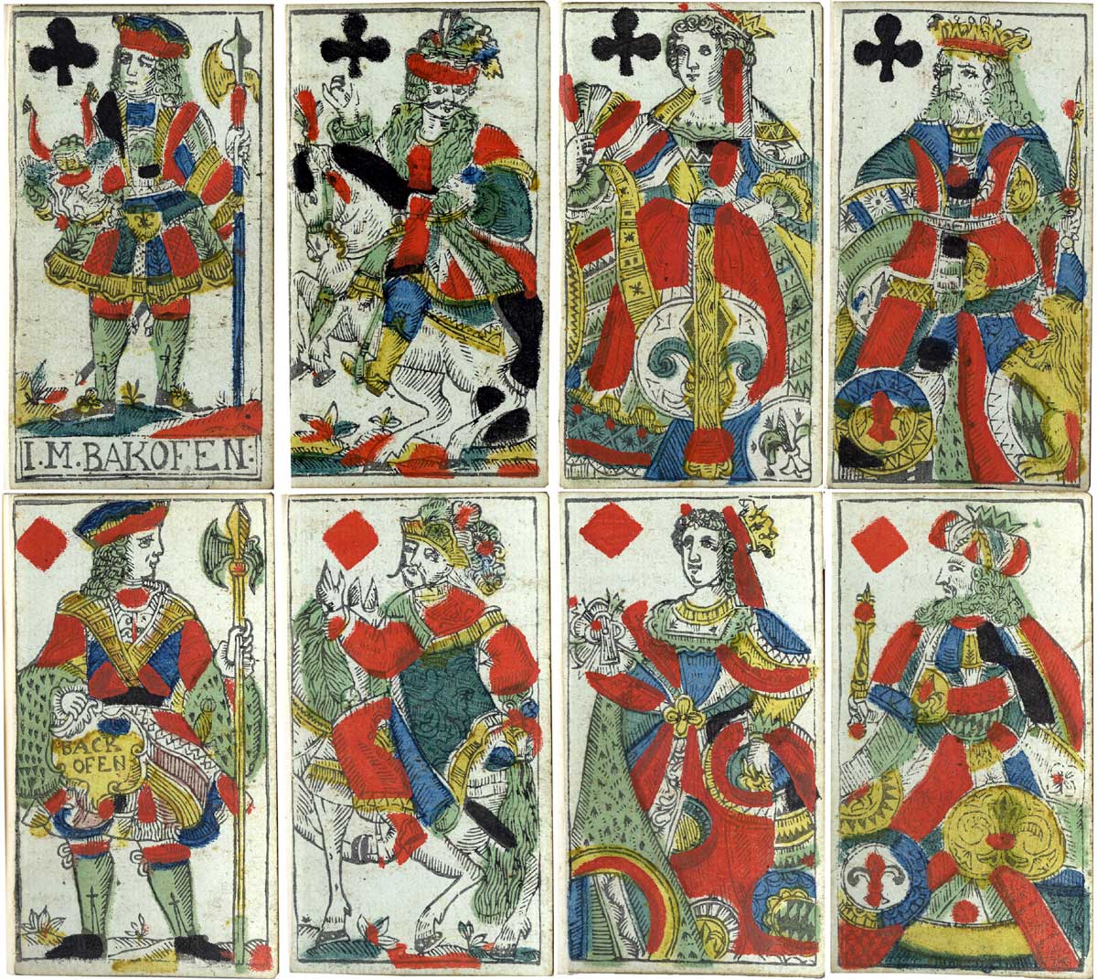 The court cards are derived from the French Paris pattern, with the addition of four cavaliers. The jack of clubs has the inscription ‘I. M. Bakofen’ along the bottom, while the jack of diamonds reads ‘Backofen’ on a small shield. Various fleurs de lys and other symbols decorate the king and queen’s robes. The king of hearts has the initials IMB on a cartouche.