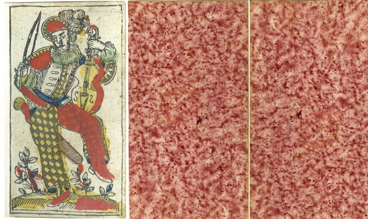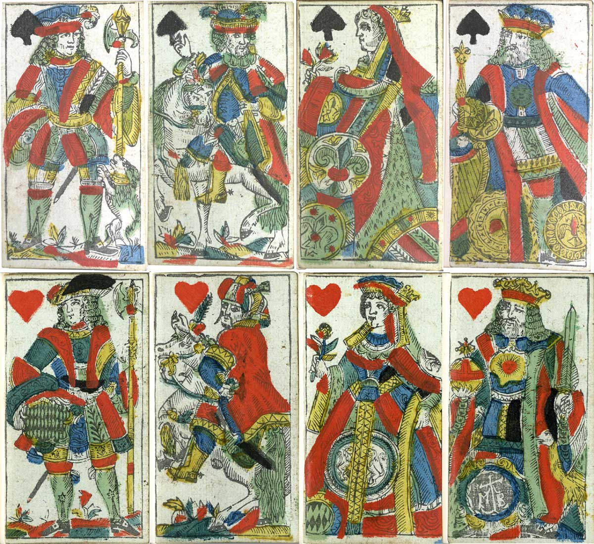 Above: French-suited Animal Tarot deck by Johann Matheus Backofen, Nürnberg, c.1790-1800. Hand-coloured woodcut, backs marbled in rose-madder, late 18th Century. Size = 110x55 mm. Lozenges of the Bavarian arms can be seen on the round shields of the King of clubs and the Queens of diamonds and hearts and the jack of hearts. © The Trustees of the British Museum • Museum number 1982,U.4615.1-78►