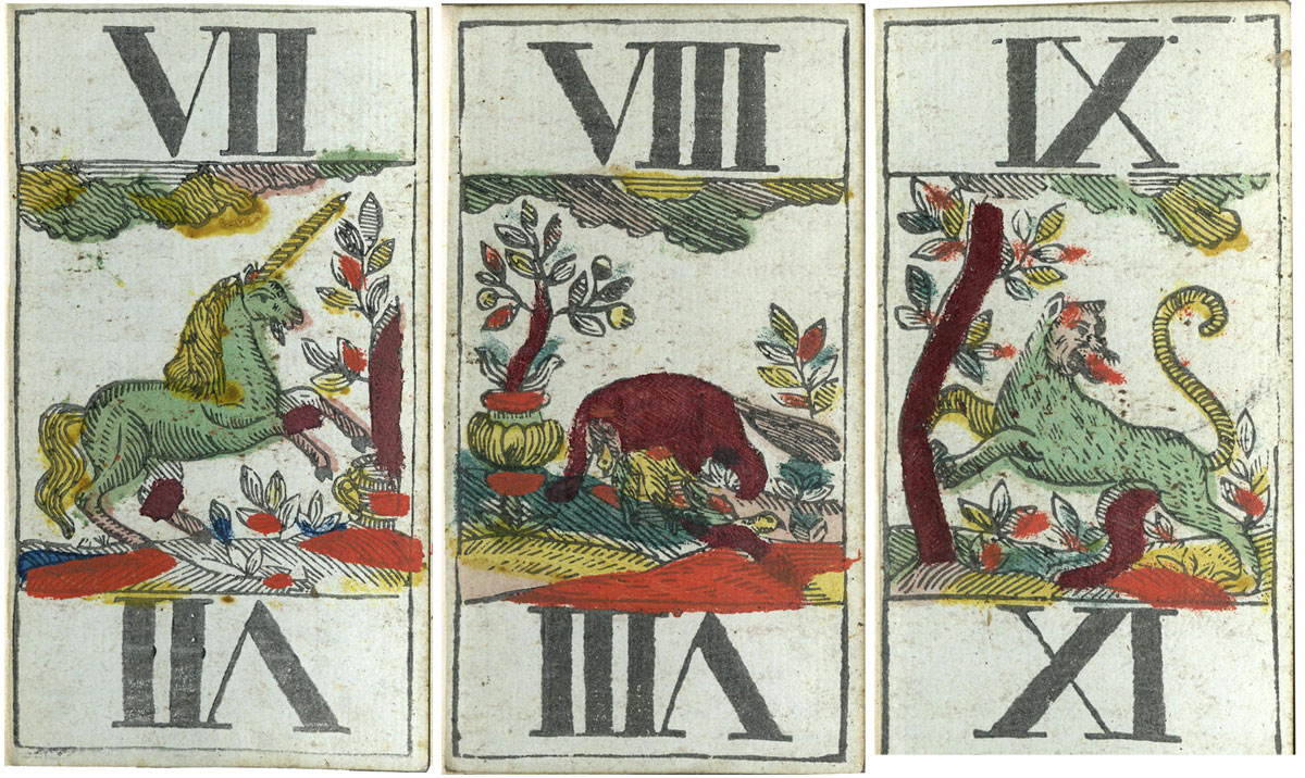 French-suited 78-card Animal Tarot deck by Johann Matheus Backofen, Nürnberg, c.1800, also known as ‘Bavarian Animal Tarot’. French-suited tarot patterns reflect different preferences and customs from state to state. The designs on these trump cards are mostly animals, birds, including no.VII which is a unicorn, in place of the usual allegorical figures found in Italian-derived tarots. Often the animal trumps follow the same order, but occasionally the sequence varies. Various types of Fools can be found, for example an oboe player, or a flautist, fiddler or lute-players may appear on the unnumbered trump card. In this deck the trunp no.I is a harlequin, with a child harlequin by his shoulder, perched on his sword.
