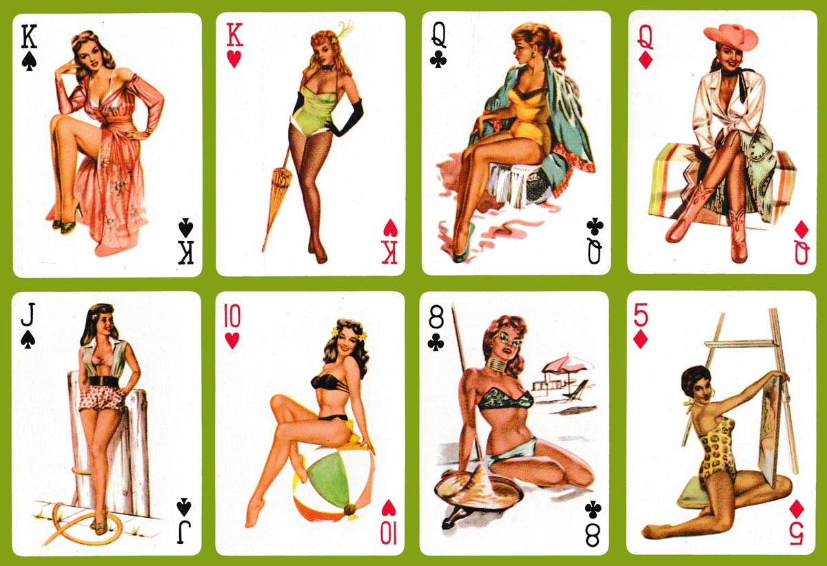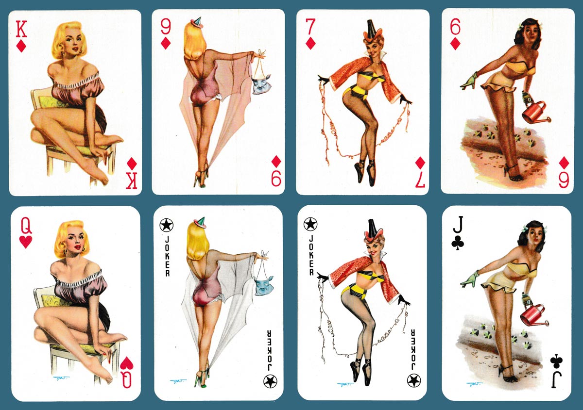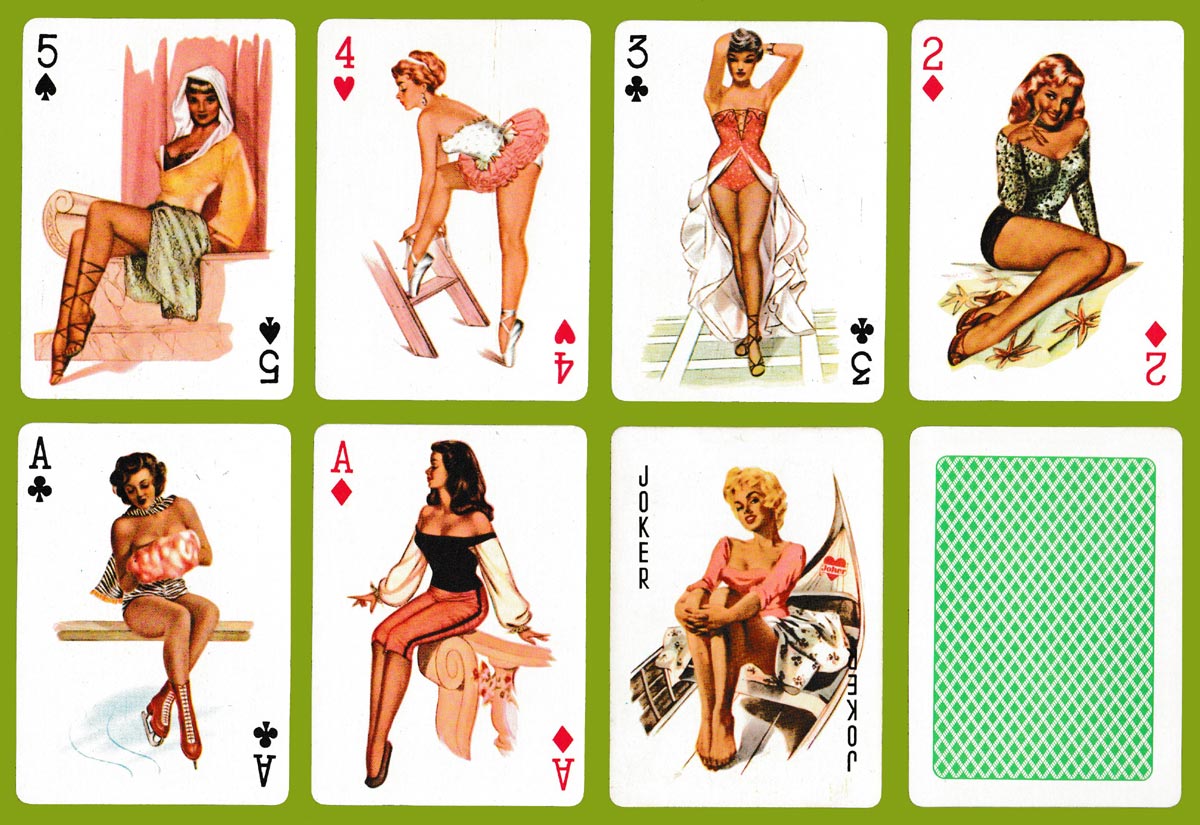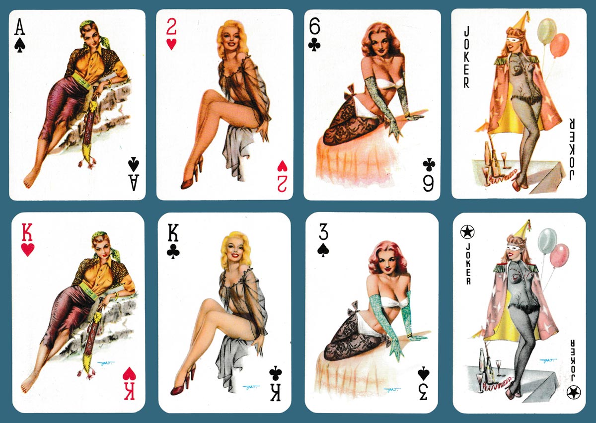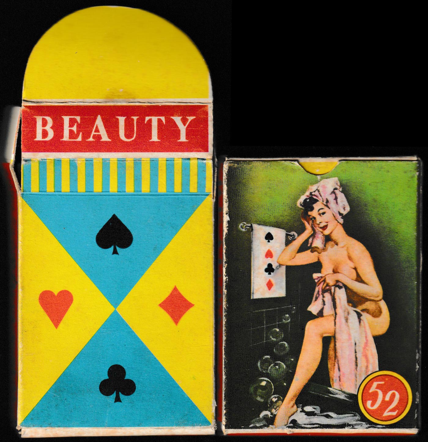 Above: “Beauty” pin-up deck with illustrations by Heinz Villiger, made by Bielefelder Spielkarten GmbH, Bielefeld, Germany, c.1955. 52 cards + 2 different Jokers in tuck box. Size: 62 x 86 mm.