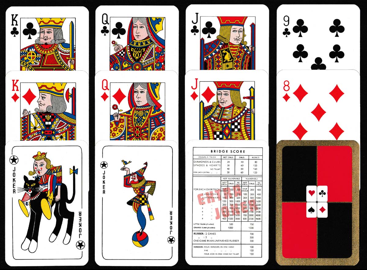 Above: Standard English pattern by Bielefelder Spielkarten GmbH, Bielefeld, Germany, c1966. 52 cards + 2 Jokers + 1 bridge score card (which doubles as an extra Joker). Size: 60 x 91 mm.