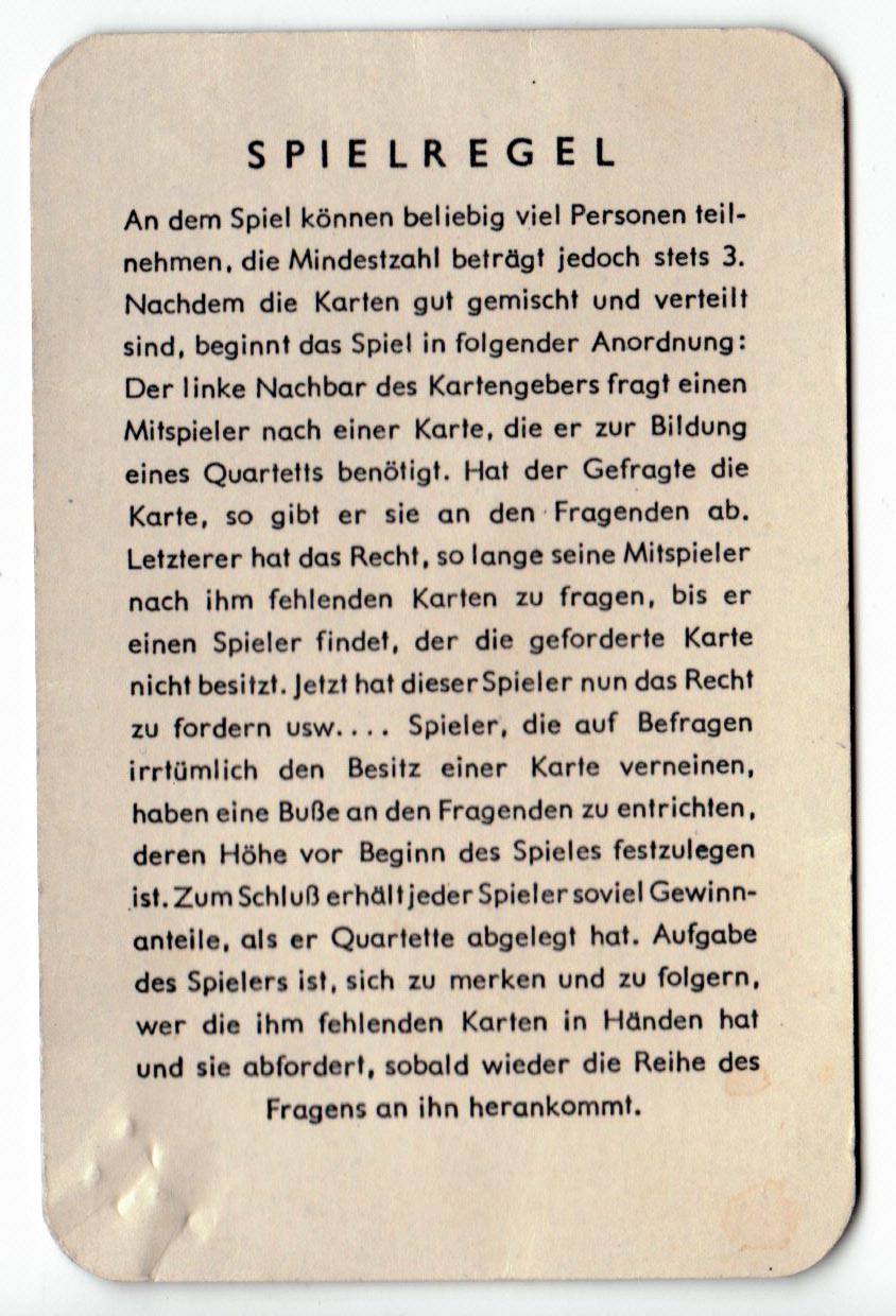 Above: Verkehrsmittel Einst und Jetzt quartet game, Bielefelder Spielkarten Fabrik GmbH, 1949 (reprinted 1956?). 36 cards + rules + title card.