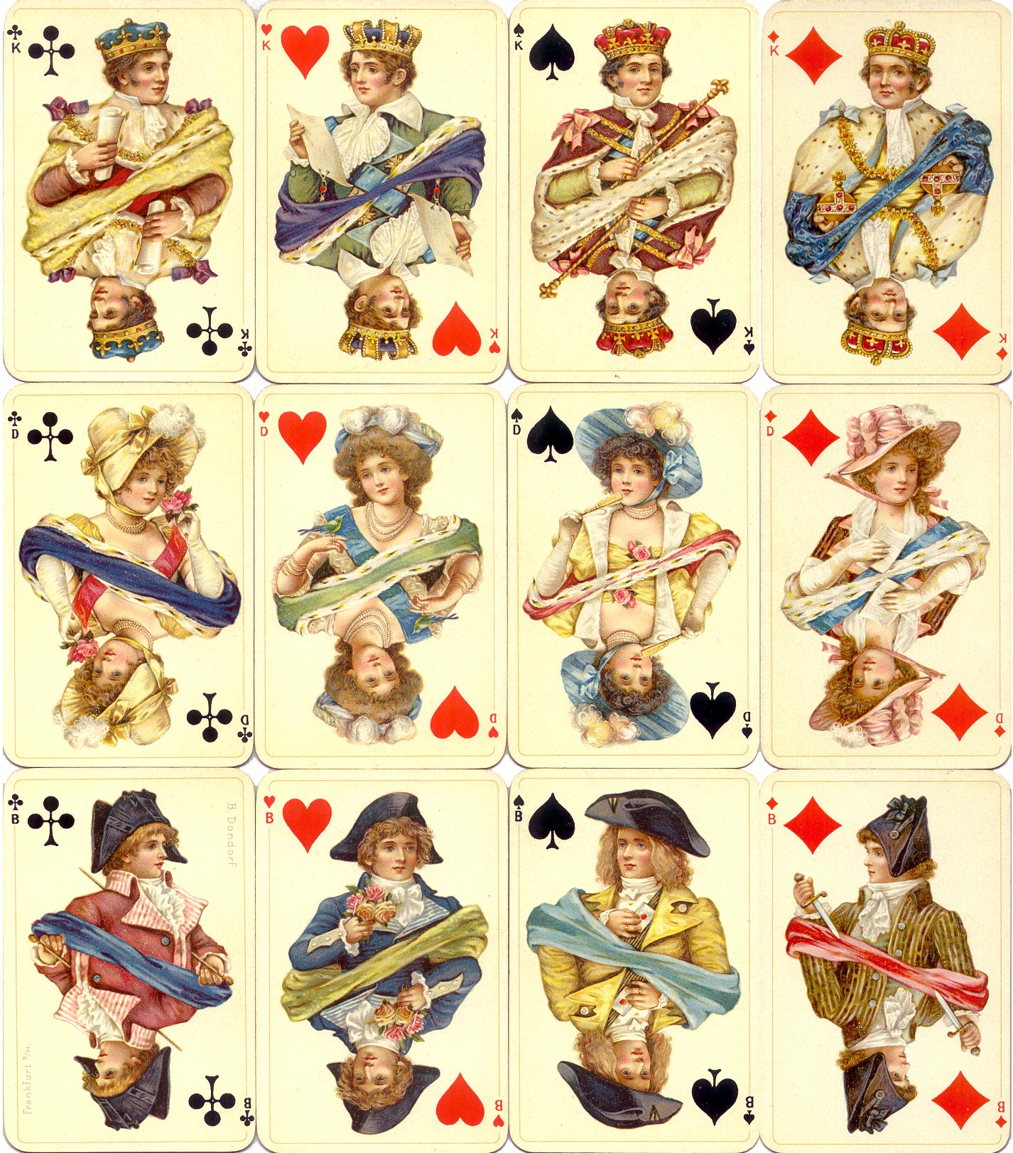 The costumes in these luxury playing cards first published by Dondorf towards the end of the 19th century are in the style of c.1800; the days of brocades, lace and periwigs are over but costumes still look like pieces of art! The four Kings carry the usual insignia and are clean shaven. The Queens, who wear short sleeved dresses with bonnets adorned with chin straps and roses, hold a rose, a fan, a bird or a letter. The Jacks, one of whom carries a sealed letter and another holds a dagger, are reminiscent of lads from the time of the French Revolution. The four Aces are decorated with ribbons and vines. Printed by chromolithography in 13 colours with the addition of red and black suit symbols.