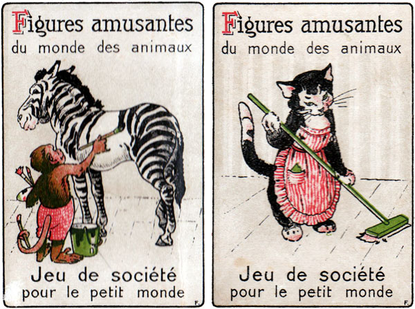 French language edition of a children's quartet game published by B. Dondorf, c.1900, consisting of 40 amusing illustrations of birds and animals with humorous captions.